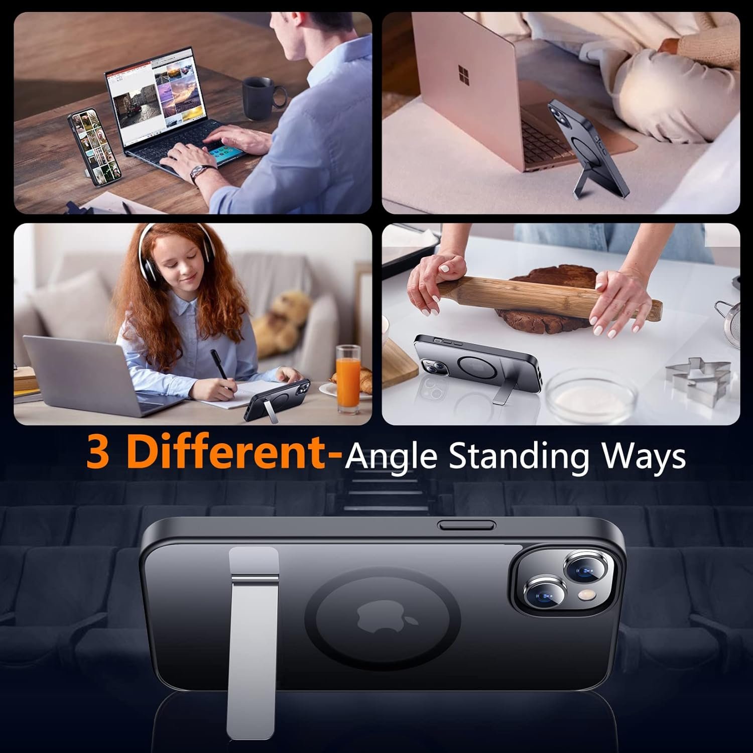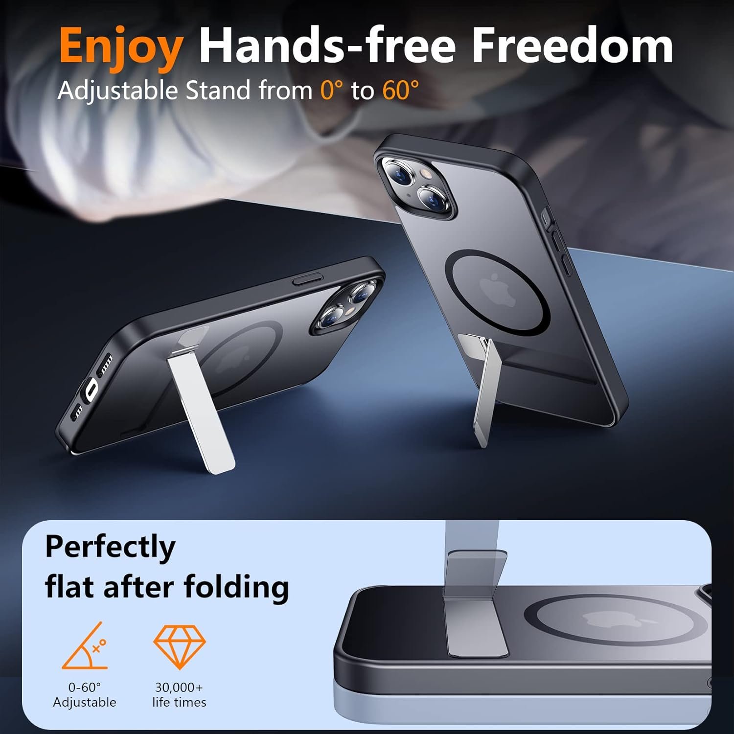 【3-Way Flexible & Functional Stand】The iPhone 13 case/iPhone 14 phone case is foldable, sturdy and built to last, with built-in handy stand made by light and solid Aerospace-grade aluminum offering a sturdy and flexible portrait, landscape or conference call mode experience.It allows you to get a more comfortable viewing angle. Reduce the frequency of looking down at the phone screen to avoid hurting your back and neck.