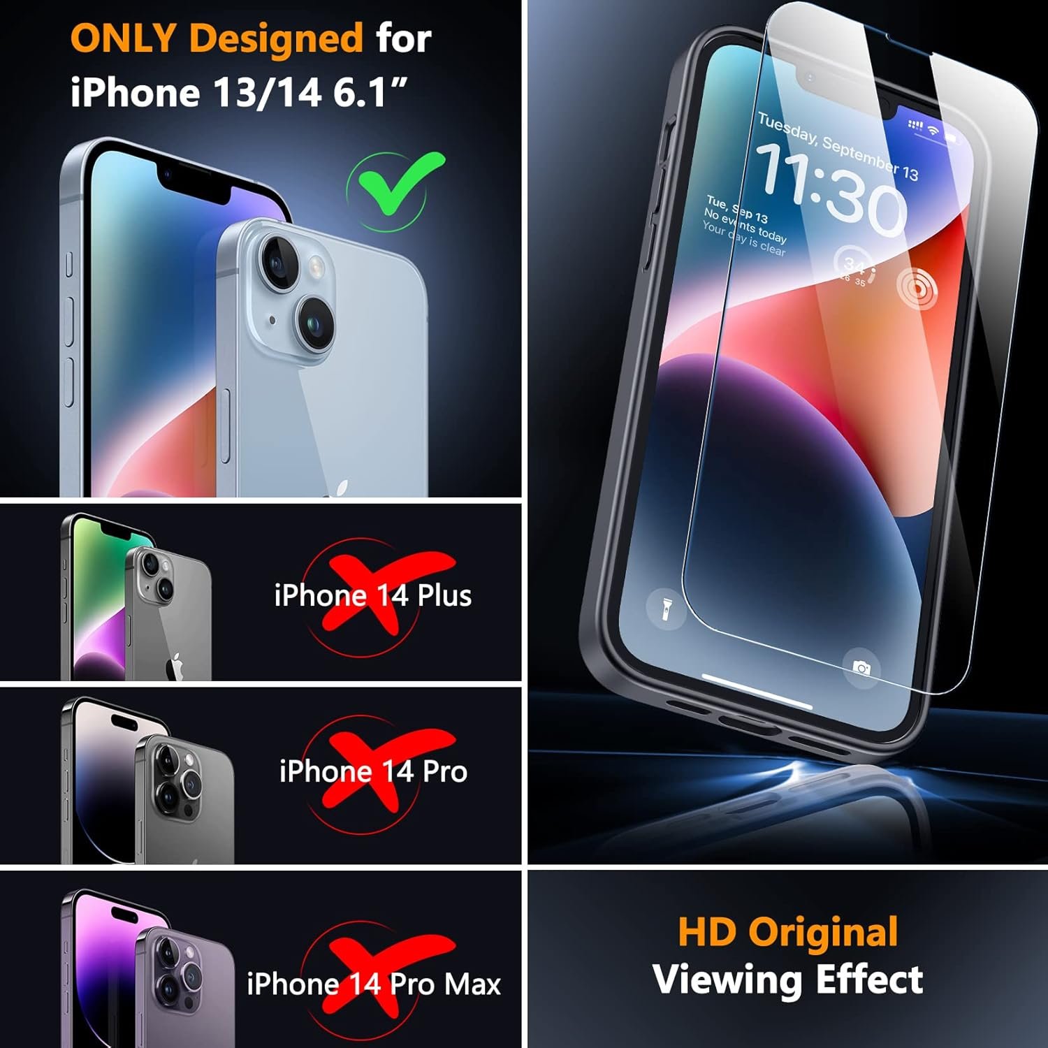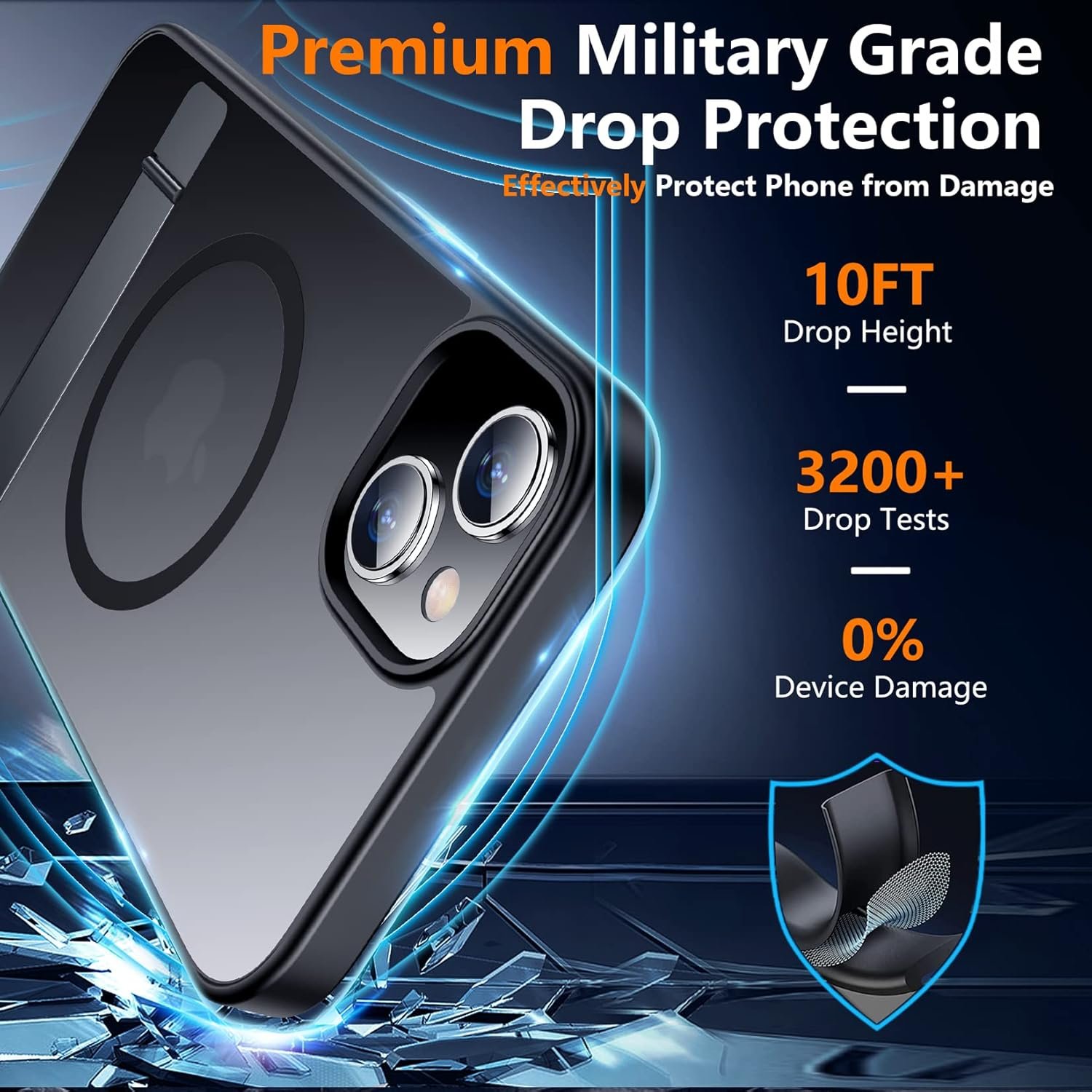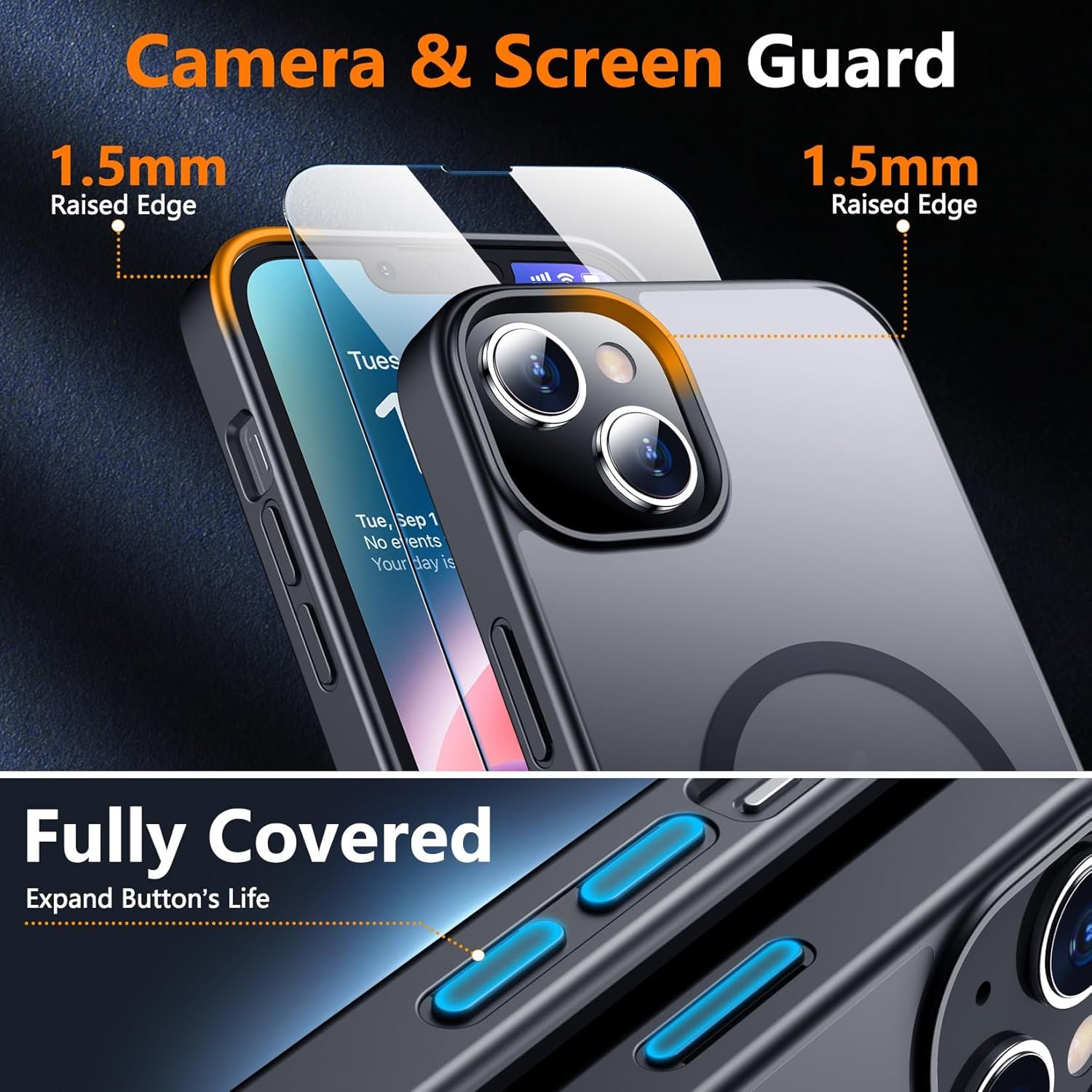 【10FT Military-grade Shockproof】The shockproof iPhone 13 case/iPhone 14 case has passed military drop tests up to 10ft, it has a tough PC brushed back and soft flexible rubber bumpers that provide strong cushioning for everyday drops. Built-in 360° all-around powerful impact-dispersing airbag and 4-corner impact-resistant corner technology. The tiny design of 1.5 mm lips over the camera and 1.5 mm bezels over the screen prevent the screen and camera from dust and scratches.