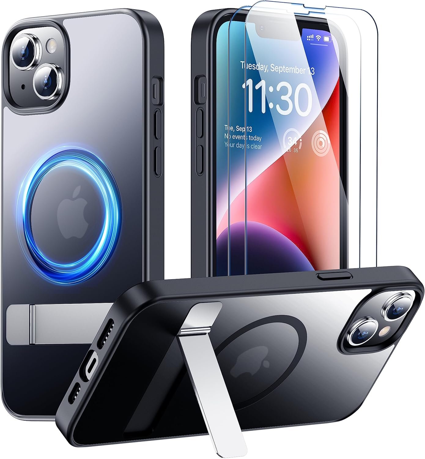 SPIDERCASE for iPhone 13 Case/iPhone14 Case, [Military Drop Protection] [with 2 Pcs Glass Screen Protector][Compatible for Magsafe] Invisible Stand Translucent Matte Case for iPhone 13/14 -Clear Black