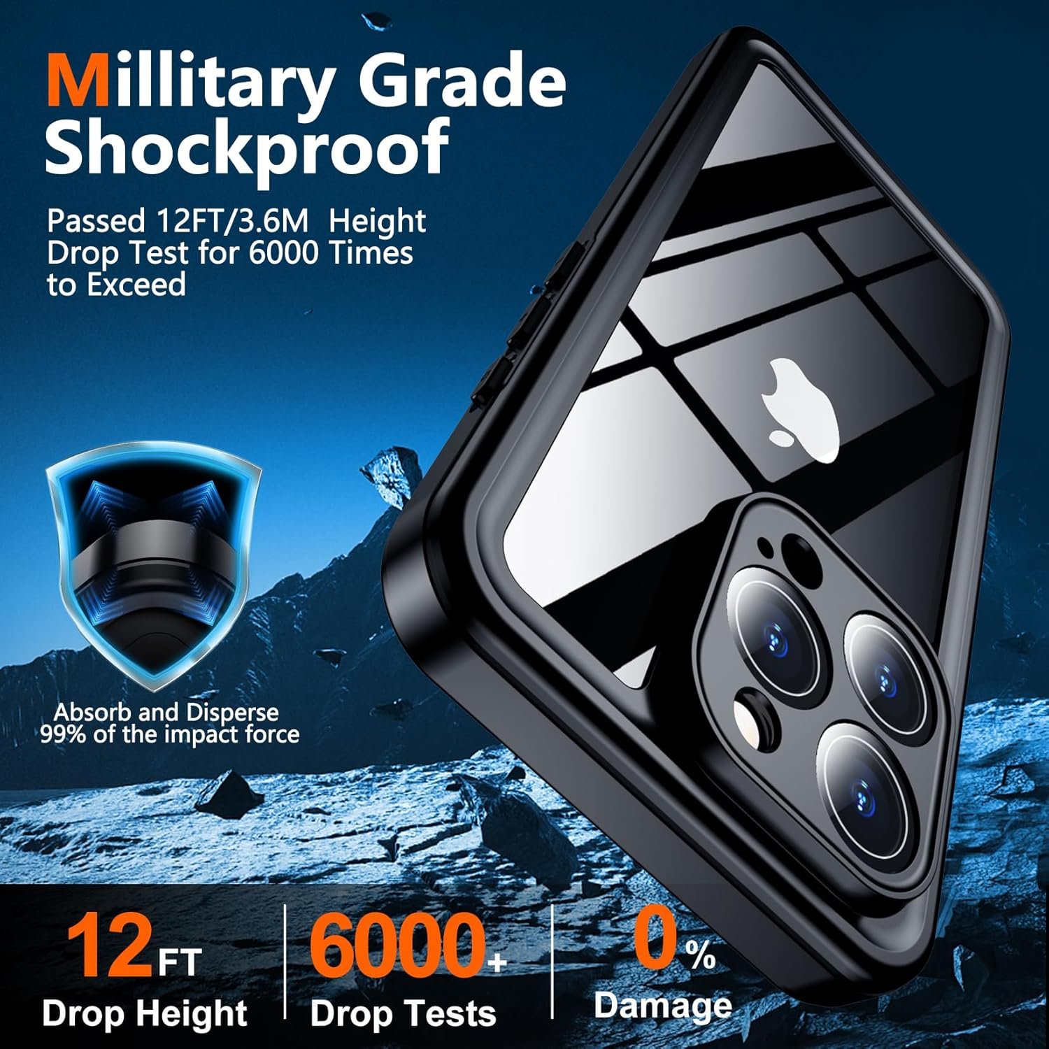 SPIDERCASE for iPhone 15 Pro Max Case Waterproof,Built-in Screen & Camera Lens Protector【IP68 Underwater】【14FT Military Shockproof】 Full Body Protection Phone Case,Black/Clear