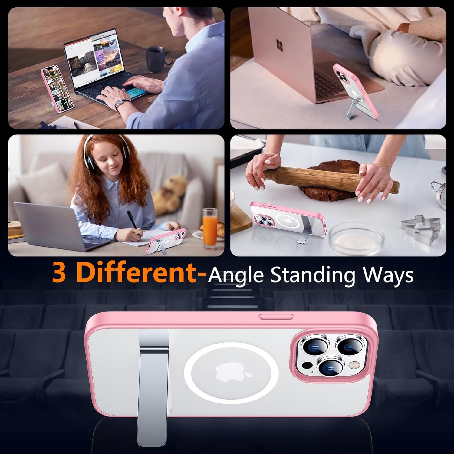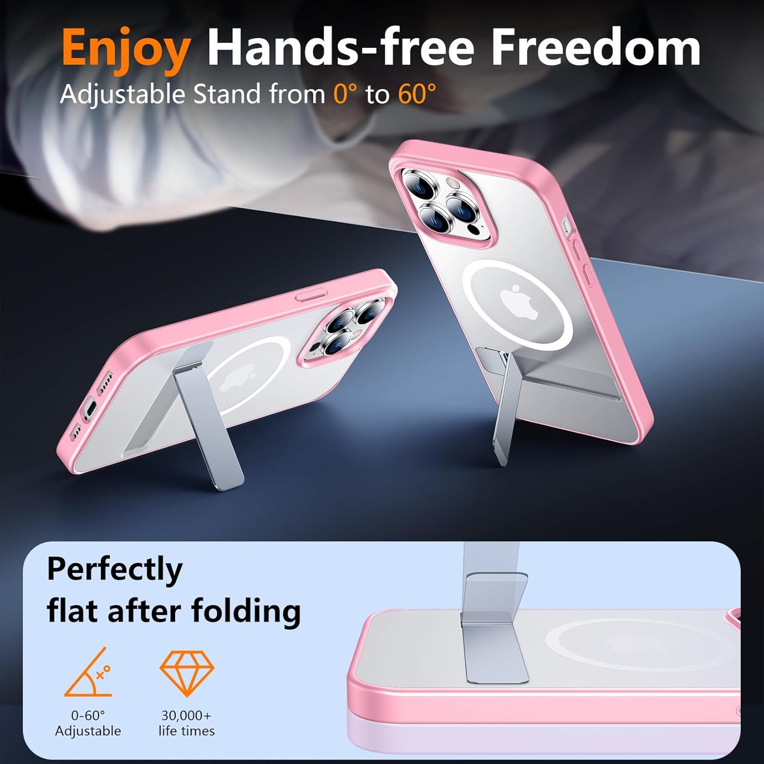 [3-Way Flexible & Functional Stand] The built-in foldable stand of this case is sturdy and durable, this handy stand made by light and solid Aerospace-grade aluminum, offering a sturdy and flexible portrait, landscape or conference call mode experience. It allows you to get a more comfortable viewing angle. Reduce the frequency of looking down at the phone screen to avoid hurting your back and neck.