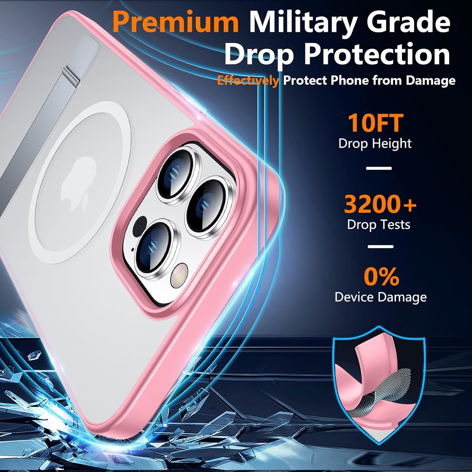 [Military-grade Shockproof] This case has passed military drop tests up to 10ft, it has a tough PC back and soft flexible rubber bumpers that provide strong cushioning for everyday drops. The tiny design of 1.5 mm lips over the camera and 1.5 mm bezels over the screen prevent the screen and camera from dust and scratches. Plus 2 tempered glass screen protectors to protect the phone screen.