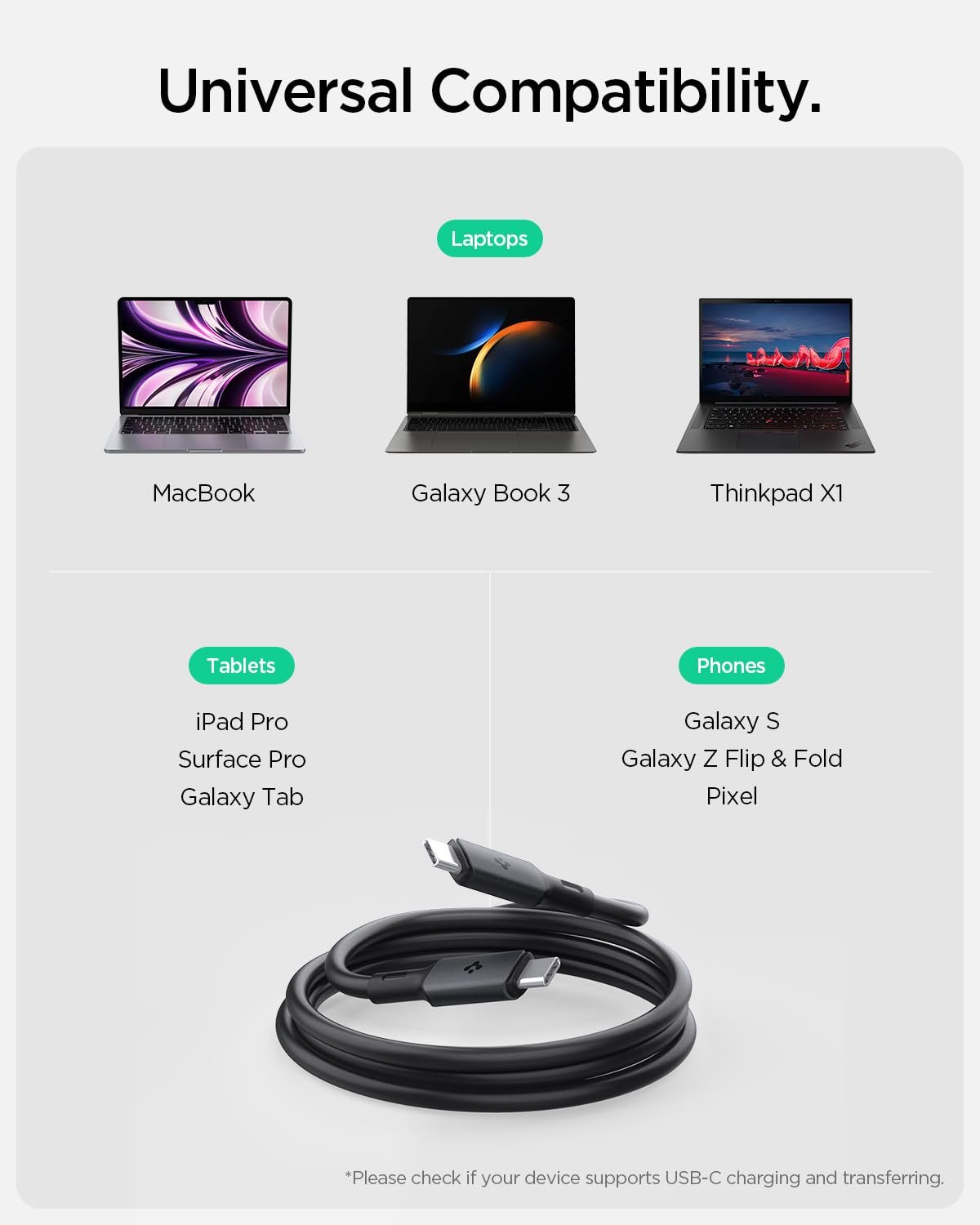Universal Compatibility: Laptops like MacBook, Galaxy Book 3, Thinkpad X1, tablets including iPad Pro, Surface Pro, Galaxy Tab, Vision Pro, and phones like Galaxy S, Galaxy Z Flip & Fold, Pixel. Please ensure your device supports USB-C charging and data transfer for optimal performance.