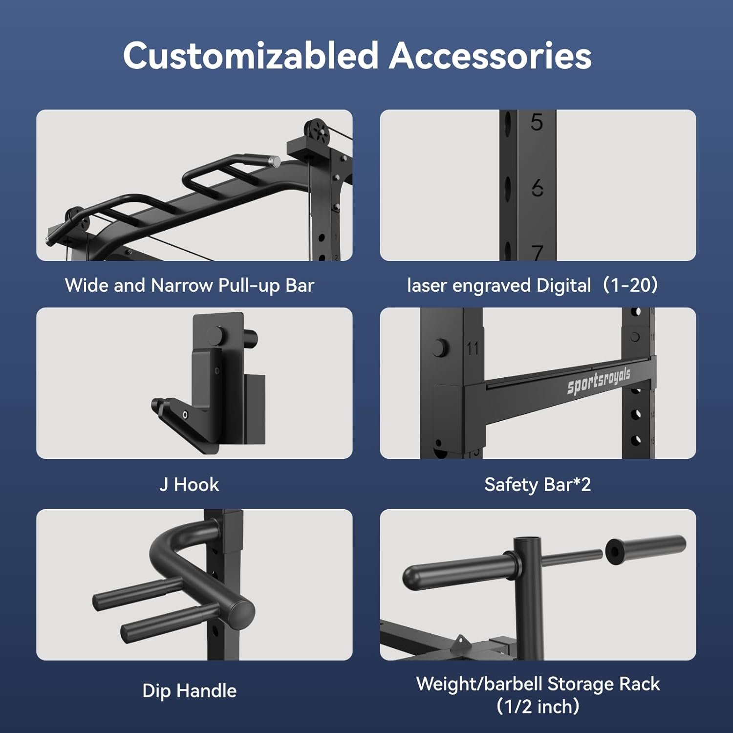 【Customizabled Free Accessories 】- NO NEED to buy the extra fitness accessories. All accessories come with our Sportsroyals home gym power cage. It included: lat pull down bar*1, cable bar*1, multi-position cable handle*2, J-Hook*2, safety bar*2, wide/narrow dip bar*2, 360° landmine*1, foot board*1, battle rope ring*1, band peg*6, 1″&2″ barbell clamps*2, weight plate bracket, In addition, the weight plate bracket of the cable crossover machine fits the 2″ Olympic or 1″ standard weight plate.