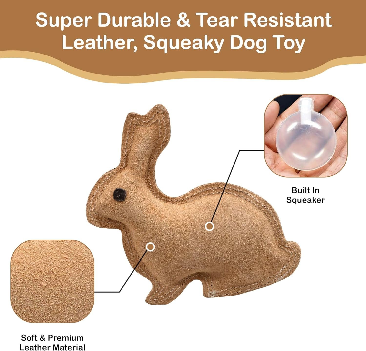 The SPOT Dura-Fused Leather Rabbit is a strong, durable dog toy made for moderate to heavy chewers. Made with real leather fused together with jute fabric for softness, and double stitched for extra strength. These fun toys are great for throwing, fetching, retrieving, chewing and cuddling. This toy is specifically designed to be resilient during rough play, but still soft and gentle on teeth. Thoughtfully created to keep your dog entertained and engaged, this will be a cute addition to any toy basket and makes a great gift for dogs of all ages and sizes. The bunny toy includes a squeaker for extra stimulation and excitement.