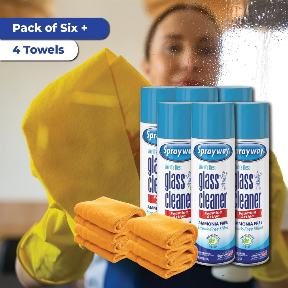 Bundle Includes: This bundle features Six 19 oz cans of Sprayway Glass Cleaner Spray Foam, renowned for its ammonia-free, long-lasting foam that effectively cleans car windows, mirrors, and more. Also included 4-pack towels suitable for versatile cleaning applications.
