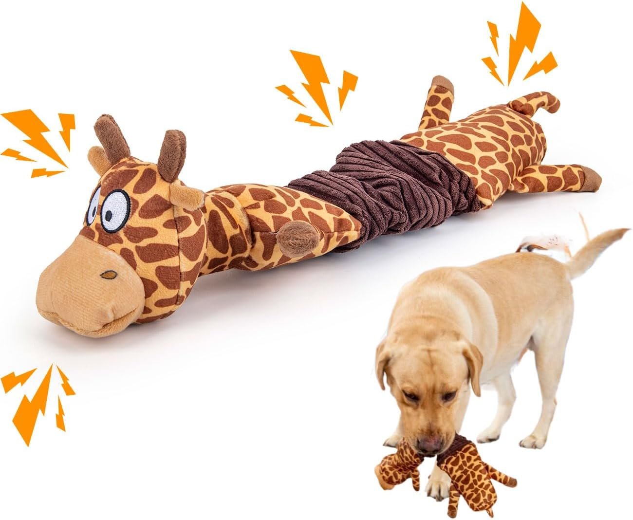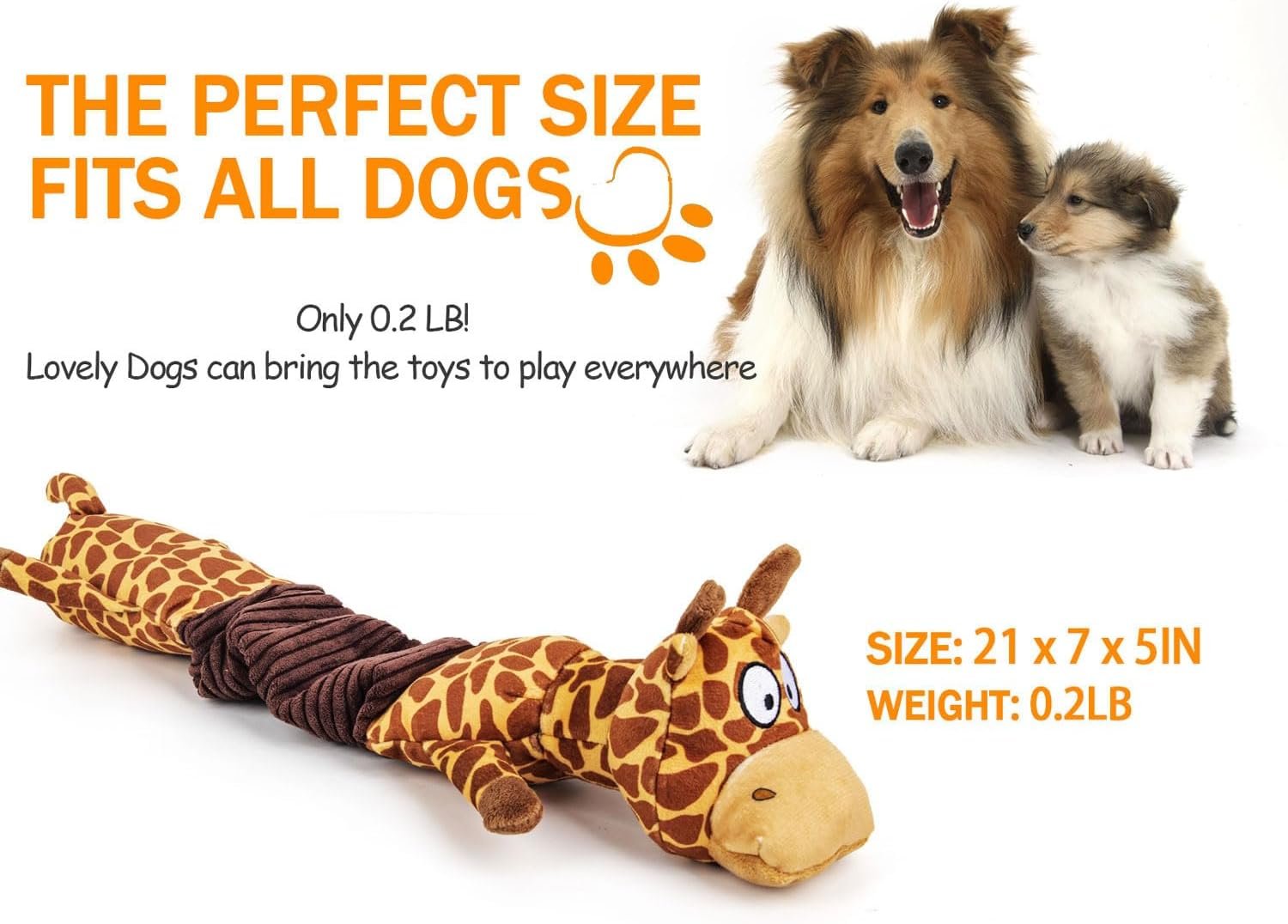 🐶【ANIMALS SQUEAKY DOG TOYS The dog toys have squeakers in both head and tail & crinkle sound paper in the middle of the body. It can make sounds when you press it or your dogs bite it, dogs will have more urge to chew it. Unique animal-giraffe character and bright colors can draw your dog’s attention. Attract the dog’s interest and satisfy the dog’s hunting instinct.