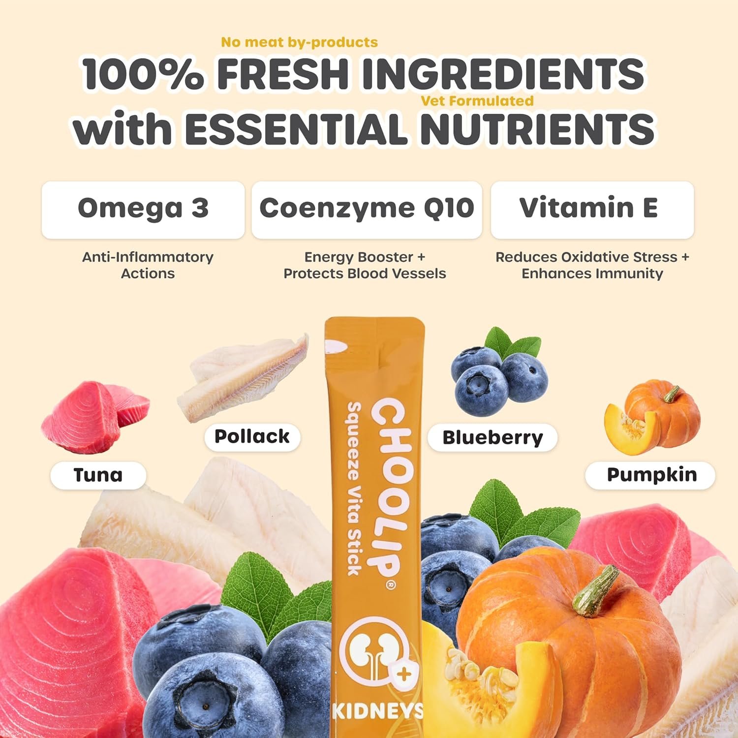 FRESH FARM TO PLATE INGREDIENTS: On the Renal Support menu: Fresh caught Tuna and Cod with a Pumpkin and Blueberry Medley, boosted with 300mg EPA/DHA, 8mg Coenzyme Q10 and 18IU Vitamin E. Rich in B Vitamins, BCAA’s, Leucine, Valine, Selenium and Potassium to support urinary tract cat food nutrition, these nutritious soft cat treats and dog treats have a pleasant aroma that humans can tolerate