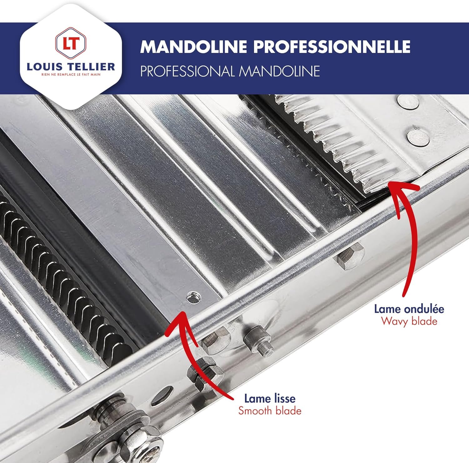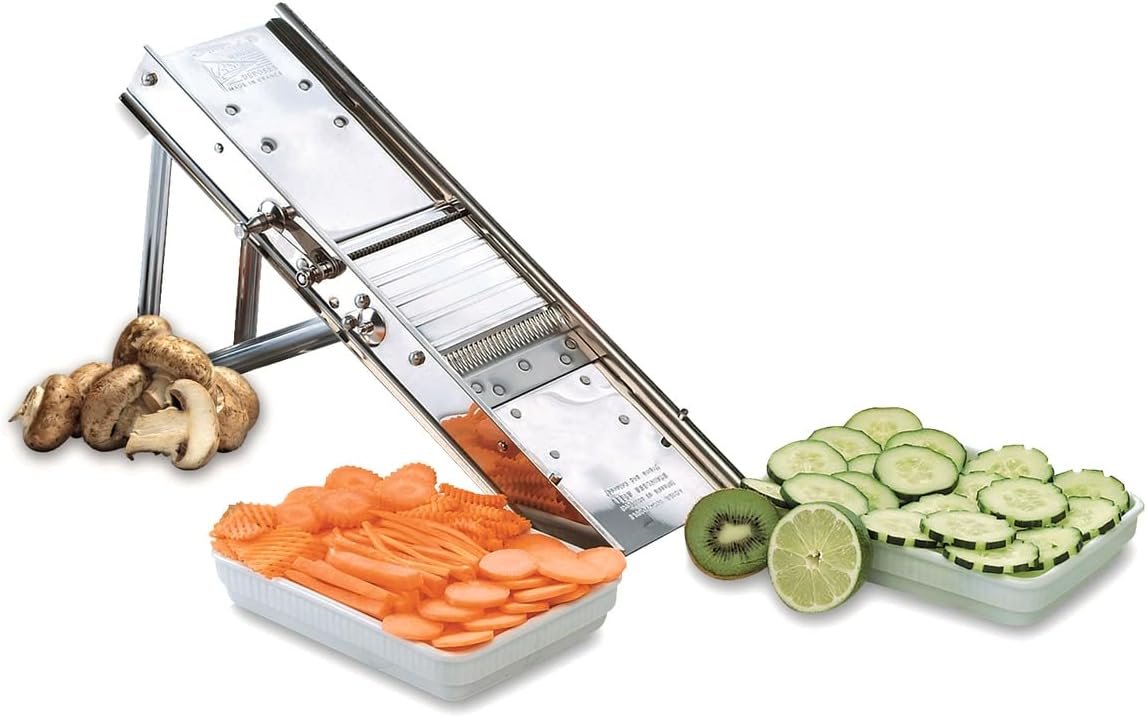 Bron Mandoline. Mandoline only, Pusher not included. Made of stainless steel. Always ready within seconds. Corrugated and straight edge blades. 2 julienne blades (1/8″ and 3/8″). 4 non-skid stands for a perfect stability.