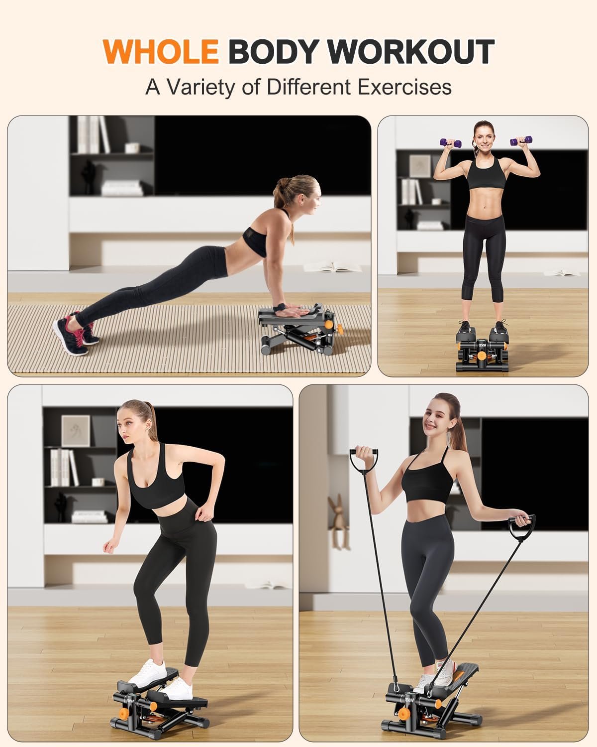💕【Fat Burning & Body Shaping】Our stair steppers is your fitness partners. As you step up and down, your heart races with excitement, feeling the burning of your waist, hips, and legs with a dynamic cardio workout that leaves you feeling invigorated and empowered. Mini stepper with resistance bands, you can elevate your workout to the next level, engaging your arms and strengthening those hand muscles for a full-body transformation