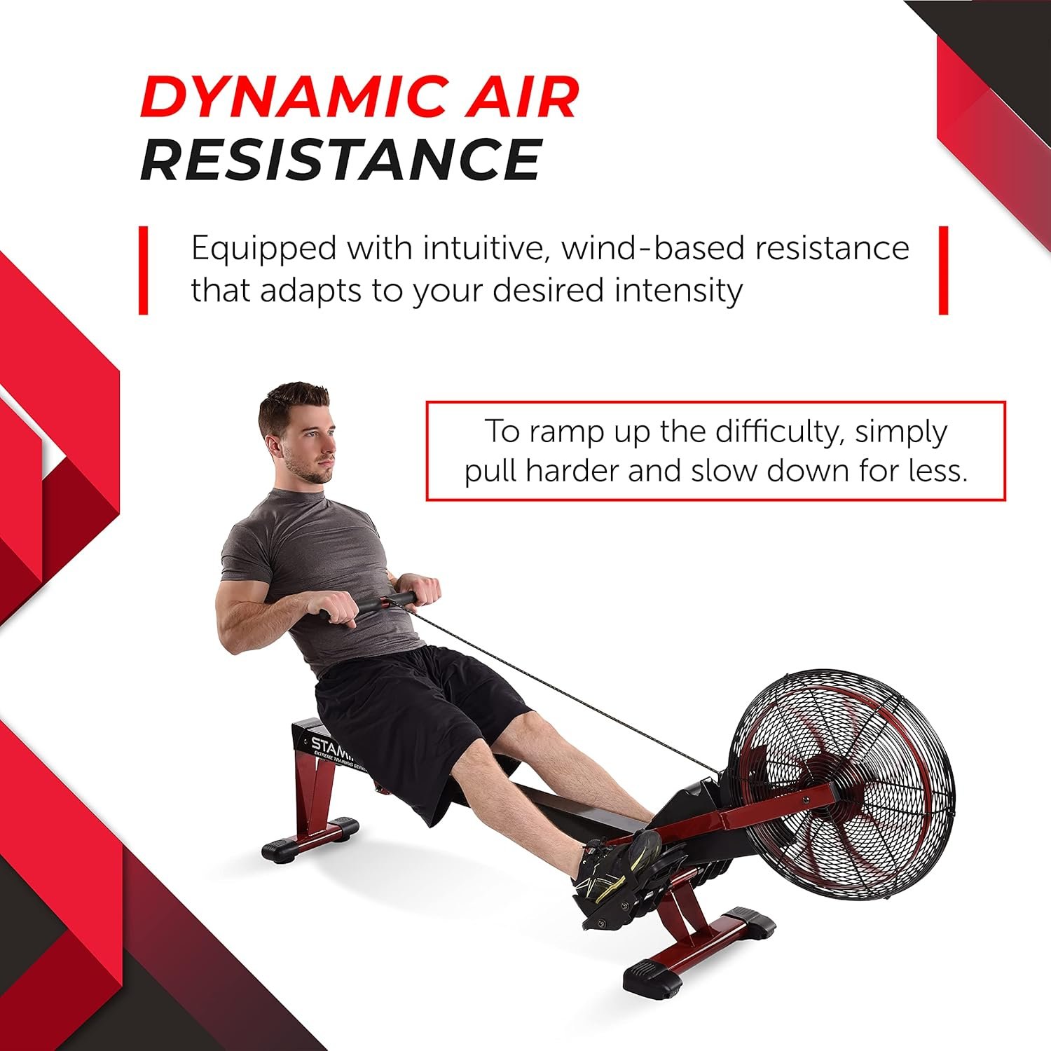 DYNAMIC AIR RESISTANCE – This rower is equipped with intuitive, wind-based resistance for a customized workout experience. The rowing chain enables the fan to accumulate user-controlled air resistance that determines your level of desired intensity.