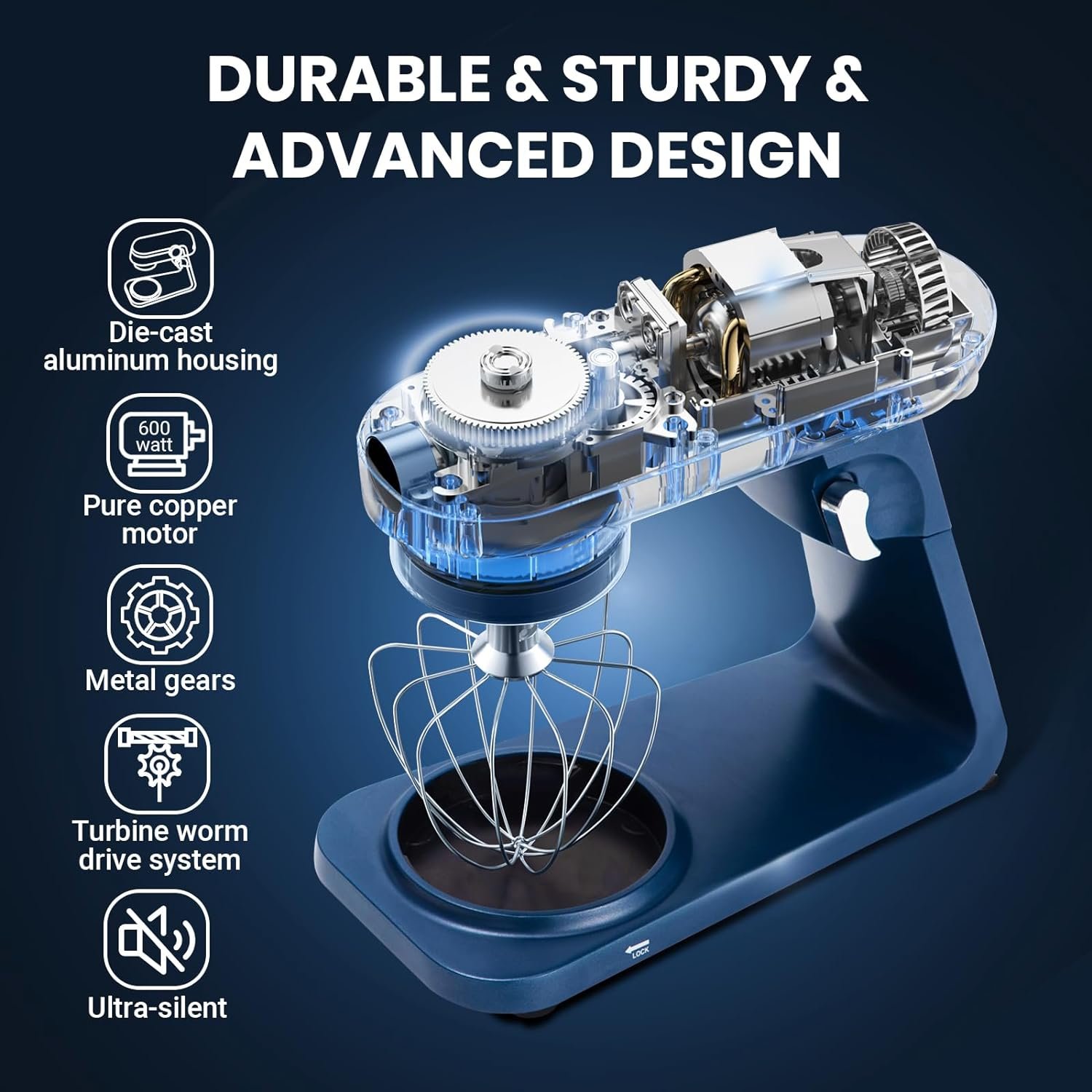 【Heavy Duty & Sturdy & Durable】The entire stand mixer is constructed with all-metal materials. Crafted with a die-cast aluminum housing, combined with metal gears and a turbine worm drive system, this mixer guarantees durability and stability. It effortlessly handles everything from dough to mixtures, making it your reliable companion for various baking and cooking tasks.