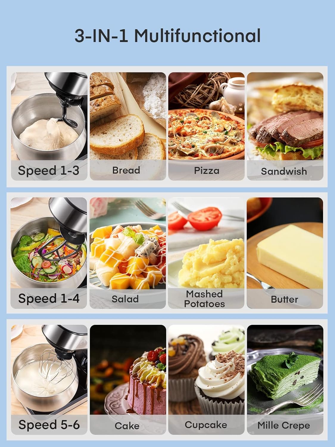 Lift Up Efficiency and Mix More Thoroughly: No more tired of preparing things!With this 600w stand mixer, you can mix bread dough, thick batters, meringues, and whip cake cream just in a few minutes. Its planetary mixing action ensures that each attachment rotates around the entire bowl as it spins at your selected speed and provides complete bowl coverage. Ingredients will be mixed more thoroughly.