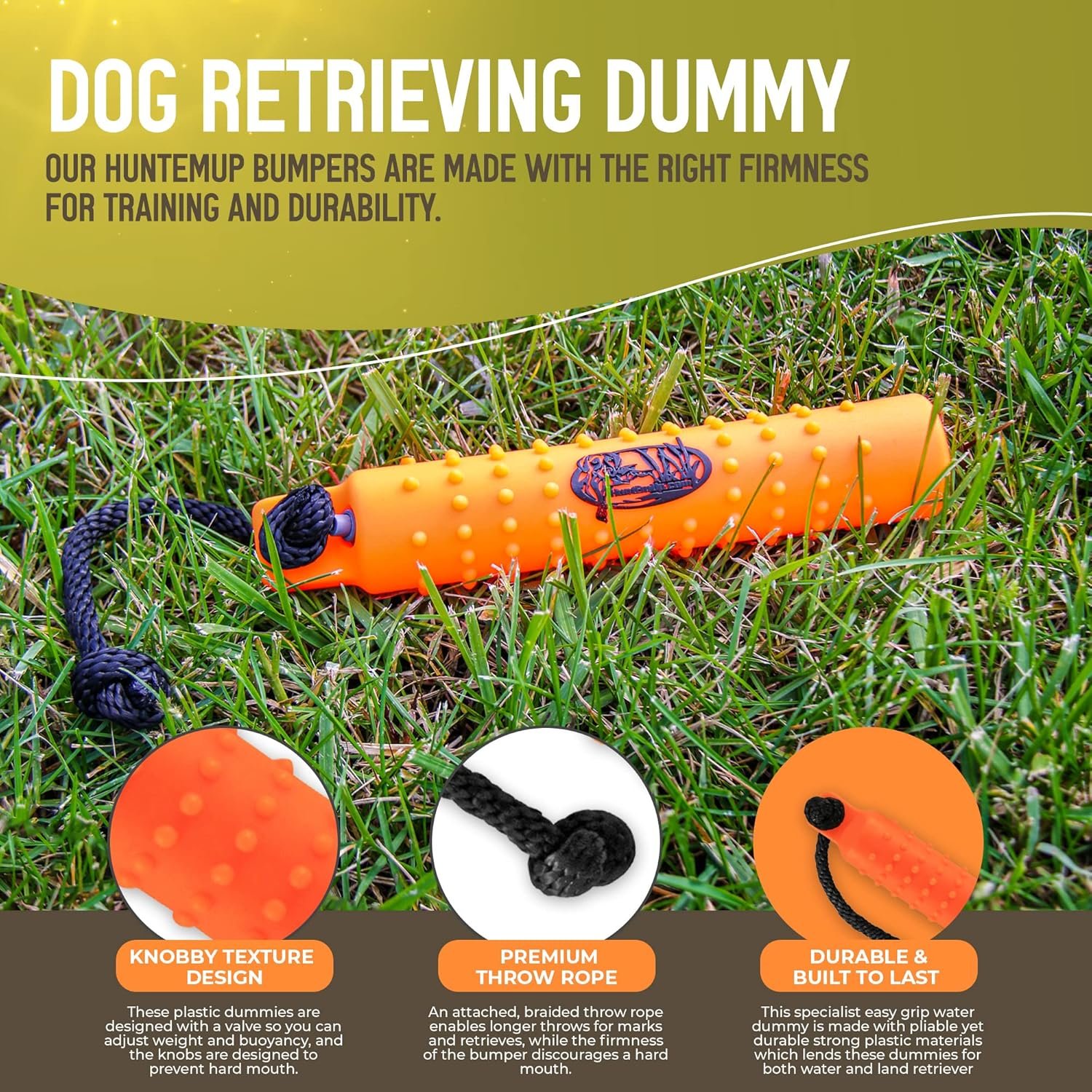 HuntEmUp Plastic dummies are preferred by many amateur and professional trainers. An attached, braided throw rope enables longer throws for marks and retrieves, while the firmness of the bumper discourages a hard mouth. There are three colors available: white, orange and Black White.