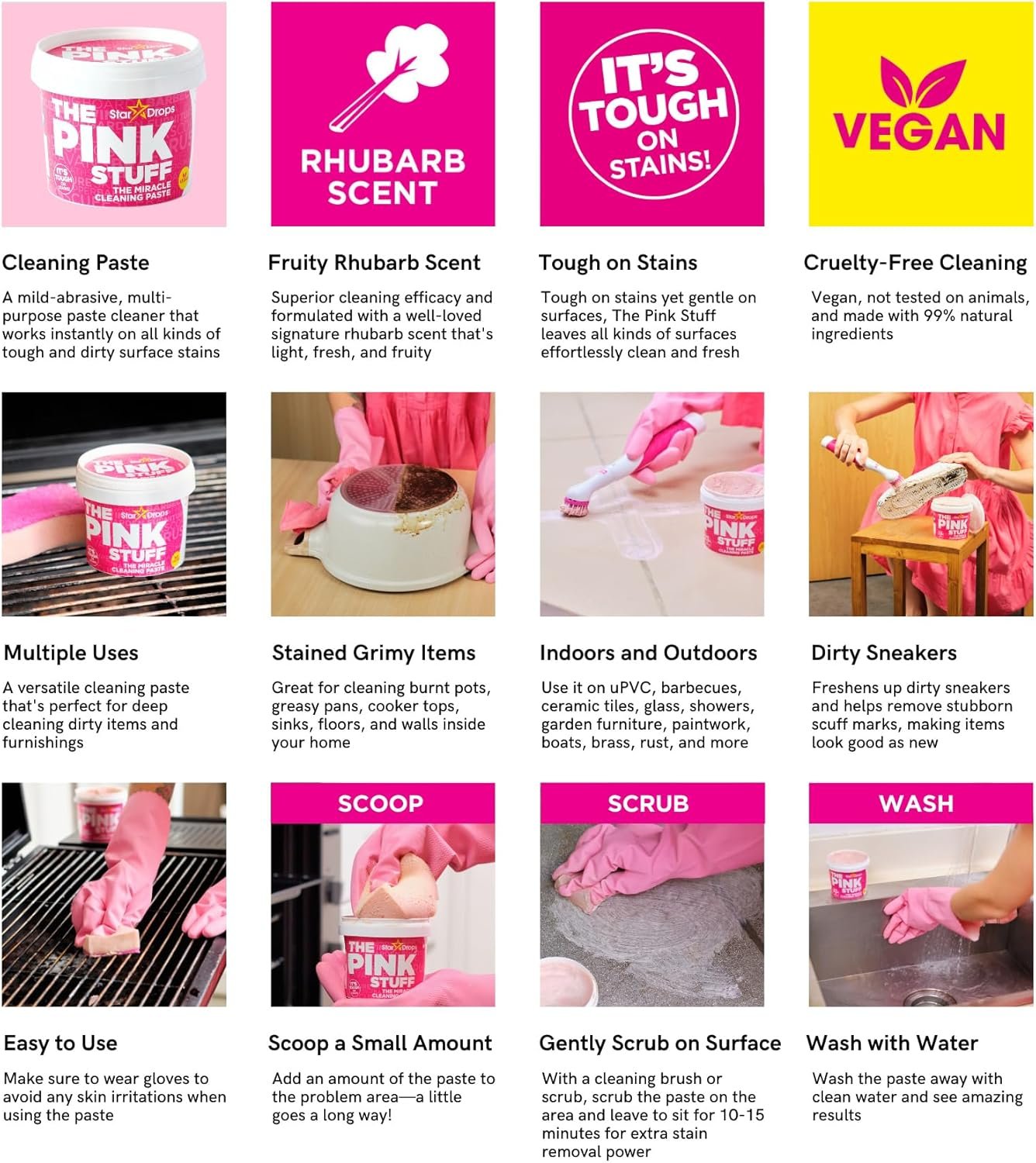 The Pink Stuff Miracle Cleaning Paste is perfect for cleaning dirt, grime and stains on saucepans, cooker tops, sinks, uPVC, barbecues, ceramic tiles, glass, showers, garden furniture, paintwork, boats, brass, and rust… the list is endless. Our Miracle Multi-Purpose Cleaner is a versatile multi-purpose spray cleaner for hard surfaces. Every surface cleaned with our Miracle Multi-Purpose Cleaner is left shiny and clean. Our Miracle Cream cleaner is a mild abrasive cream cleaner for hard surfaces. This versatile liquid cream cleaner is made from natural particles to provide consistent cleaning power. This cleaner can clean surfaces throughout the home.