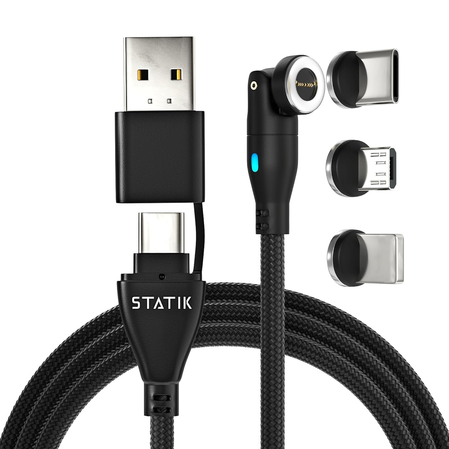𝟑-𝐢𝐧-𝟏 𝐔𝐧𝐢𝐯𝐞𝐫𝐬𝐚𝐥 𝐂𝐡𝐚𝐫𝐠𝐢𝐧𝐠 𝐂𝐚𝐛𝐥𝐞: Statik 360 Pro was designed to eliminate the need for multiple cables to meet your multiple device charging requirements. This 100W magnetic fast charging cable includes 3 magnetic tips including Type-C and Micro USB to charge any device plus a USB-C and USB-A adapter to work with any power adapter.