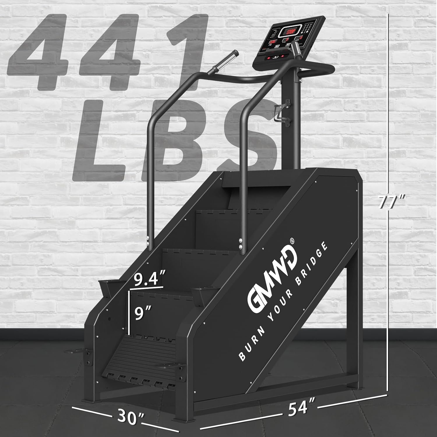 【Product Dimension】Overall Dimension: 54”×30”×77”(Recommended ceiling height 8’83”); max bearing capacity up to 660lbs; gross weight: 441lbs; step area: 9.4”(H)×22”(W), 50SPM; step-up height: 9″(commercial size). Arrives 90% assembled.