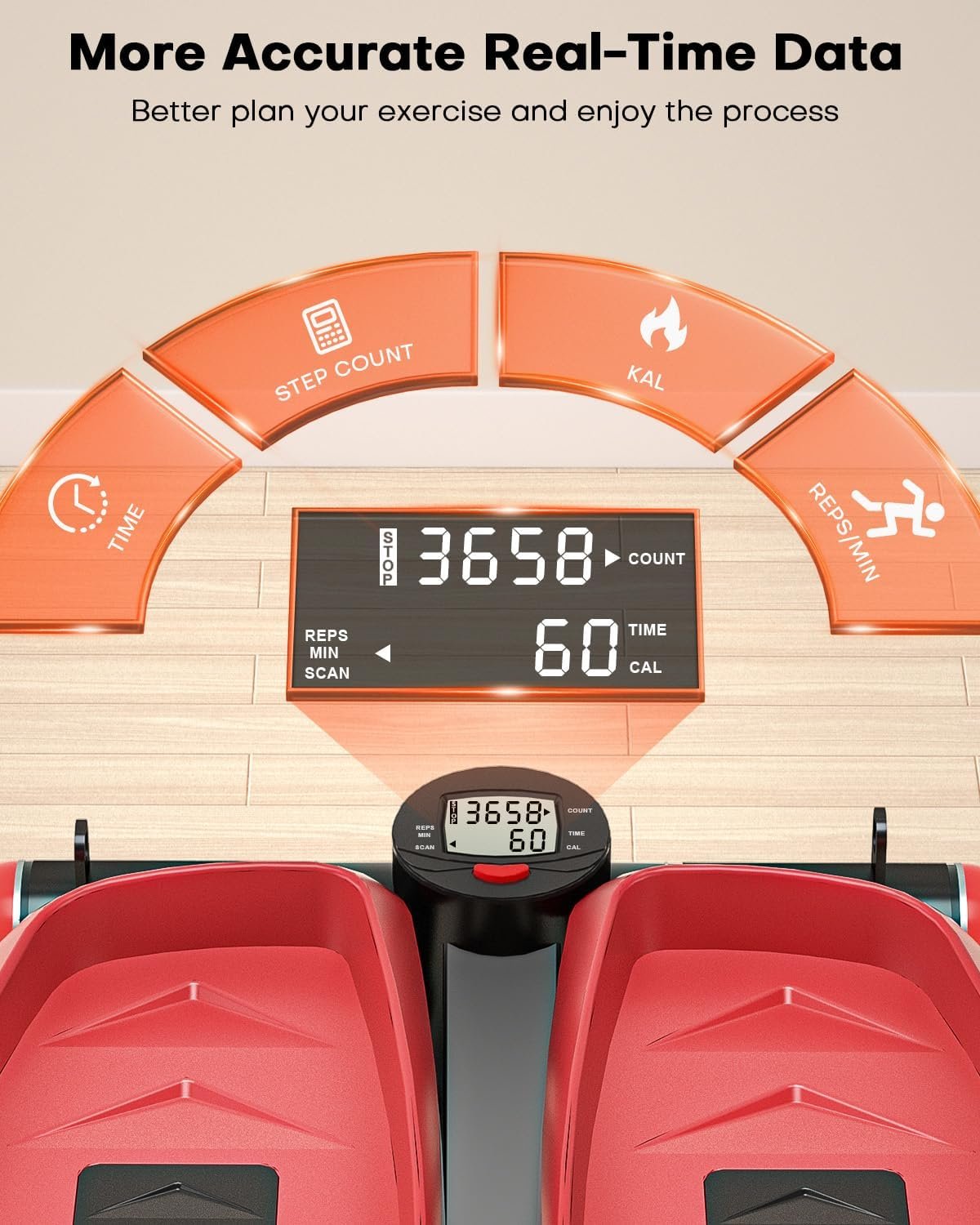 Adjustable Height for Customized Workouts: This stepper features a convenient adjustment knob located at the back, allowing you to easily set the stride height to suit your needs. A lower stride offers a gentler workout, while a higher stride replicates the challenge of climbing stairs. In this mode, you can experience nearly double the exercise benefits compared to other steppers that lack adjustable height.