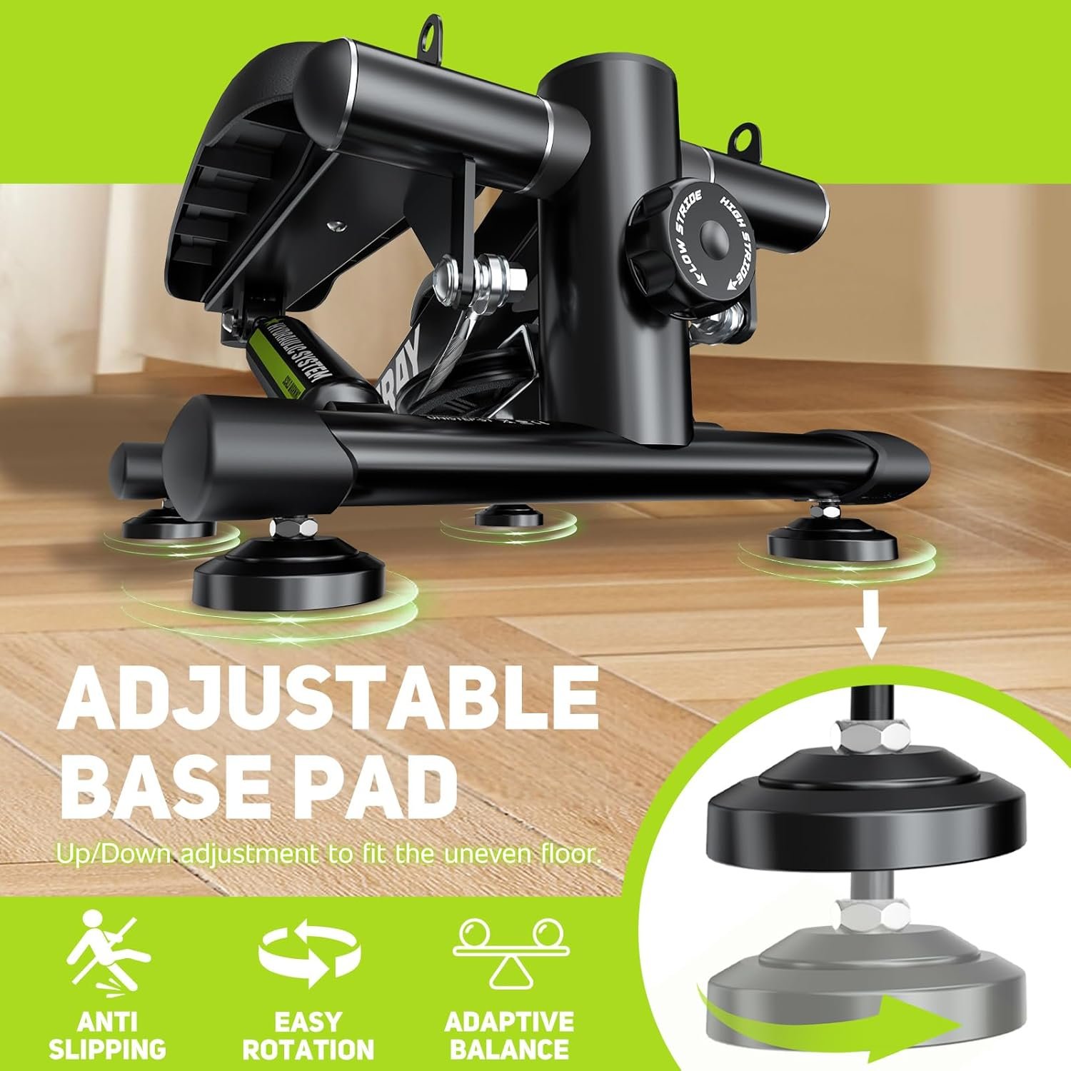Easy Stride Adjustment: The angle between the high and low pedals can be adjusted from 19° to 30°, allowing for both gentle walking and vigorous cardio. Simply twist the adjustment knob to change the angle.