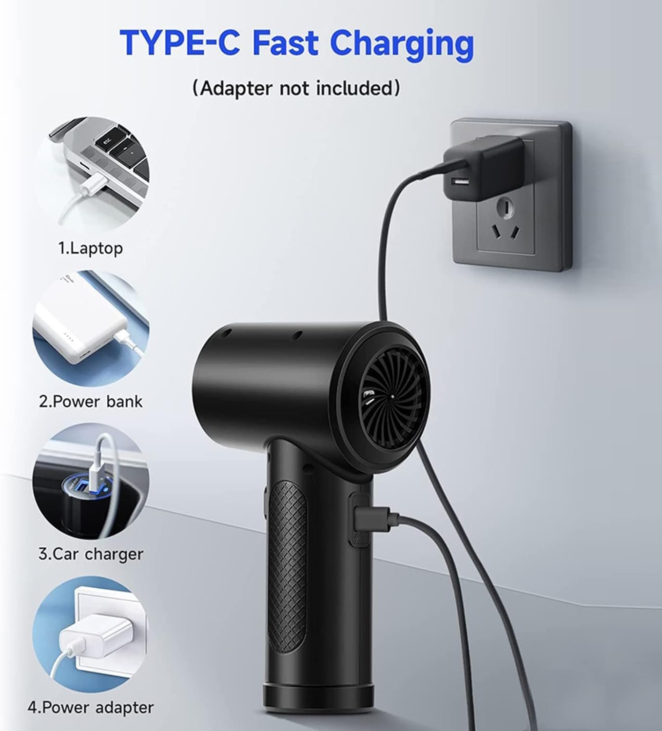 The Cordless air duster equipped with a Type-C USB data cable,this rechargeable air duster can be charged by multiple electronic devices, such as computer, power adapter, power bank, car chargers.