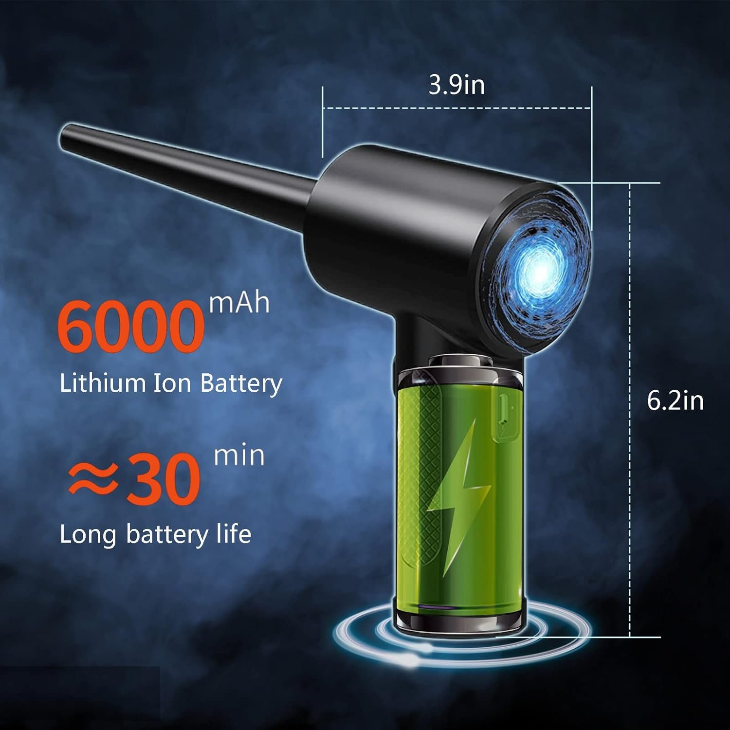 The air duster adopts a high performance motor, the speed can reach 51000RPM, and the air output is larger. Strongly remove stubborn dust from deep inside objects.The electric compressed air duster has a built-in large capacity battery of 6000mAh, and the continuous running time can reach 30min.Owning one electric air duster is equivalent to owning an infinite number of disposable canned air duster. It is the perfect replacement for disposable canned air duster.