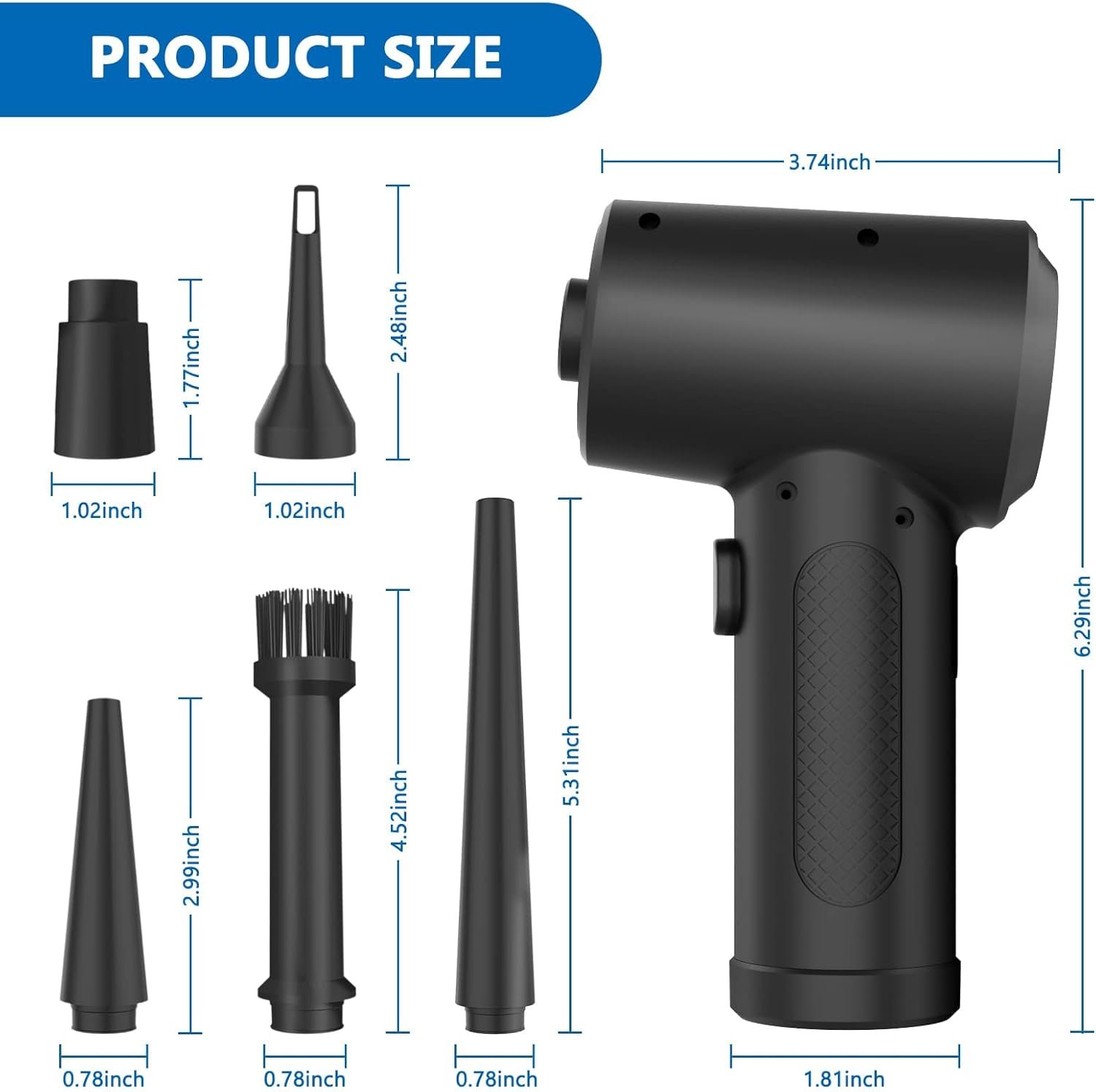 5 Blow Accessories and LED Light Design: Built-in LED light design helps more thorough cleaning. Provide 5 nozzles for this electric air duster and a storage bag. The removable nozzle makes the product easier to store and carry and is suitable for various space utilization making it easier to clean corners or places where the hand cannot reach.