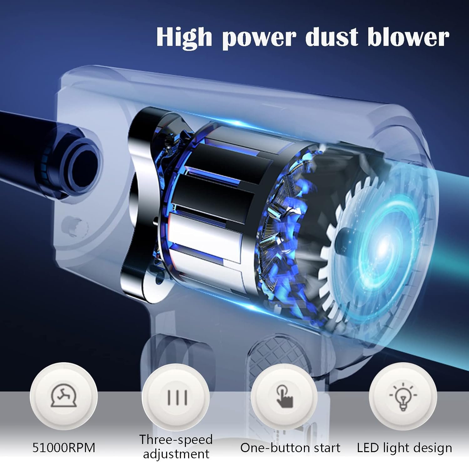 Powerful Deep Cleaning(3 gear speed): The motor speed of this electric air duster is increased to 51000RPM. That produces a powerful thrust of air at almost 10 levels strong gale (28m/s). The air duster is also designed with 3 gear speed wind (51000RPM to 43000PRM) for depth cleaning dust, such as computers, keyboards, sofas, and cars. Or some electronic devices that are not easy to clean.