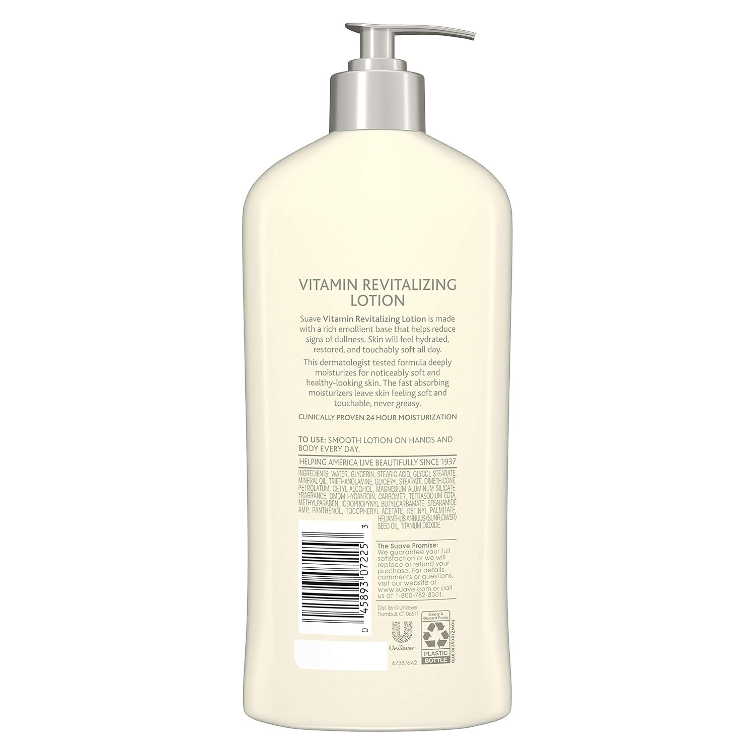 Indulge in Suave Revitalizing Body Lotion with Vitamin E that provides 60% more moisture to make your skin look noticeably healthier and beautifully radiant. This unique formula with a combination of the anti-oxidants vitamin E and A, along with Pro-vitamin B-5, restores moisture to parched skin. The rich emollient base helps make dullness disappear and helps restore the soft, smooth feel of your skin. This lotion with vitamin E provides clinically proven moisturization. For best results, smooth lotion on hands and body every day. Try all Suave Professionals Body Lotions. Suave Skin Solutions body lotions are clinically proven to provide 24-hour moisturization, keeping your skin looking beautiful. Choose a variety of flavors within the range including best selling Cocoa Butter and Advanced Therapy. Also available is the Suave Essentials line up with delightful fragrances such as Wild Cherry Blossom or Lavender Vanilla to awaken your senses. The newest additions to the Suave Essentials line include Suave Tropical Coconut body lotion and Suave Cucumber Agave Smash body lotion. The Suave Skin Solutions line includes five variants: Advanced Therapy, Smoothing Cocoa Butter, Silkening with Baby Oil, Soothing with Aloe and Revitalizing with Vitamin E. Try them all! With Suave you can enjoy beautiful skin everyday.