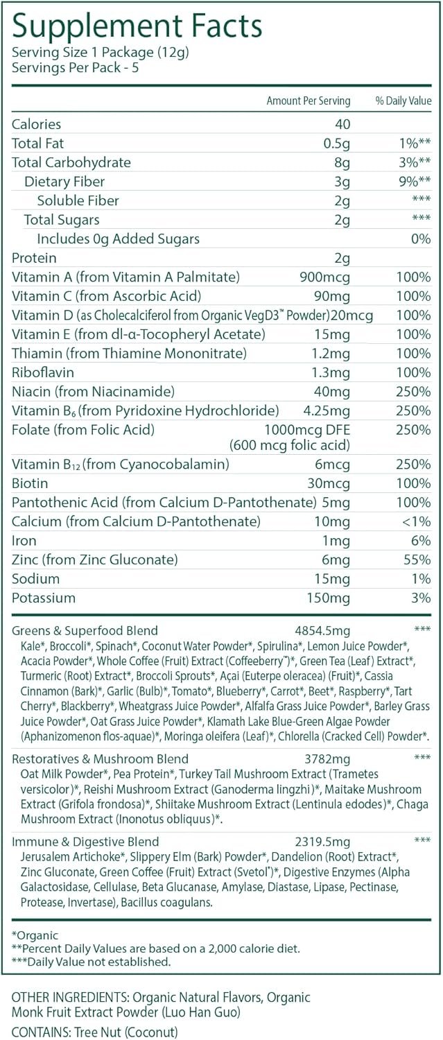 SUPPORTS IMMUNITY& DIGESTION: Our Superfood Greens Powder is made with a blend of over 40 functional, feel-good ingredients, including kale, broccoli, spinach, coconut water powder, spirulina, turmeric, and an organic restorative mushroom blend. With 1 billion CFUs of probiotics and digestive enzymes, our powder helps support digestive health and immunity.