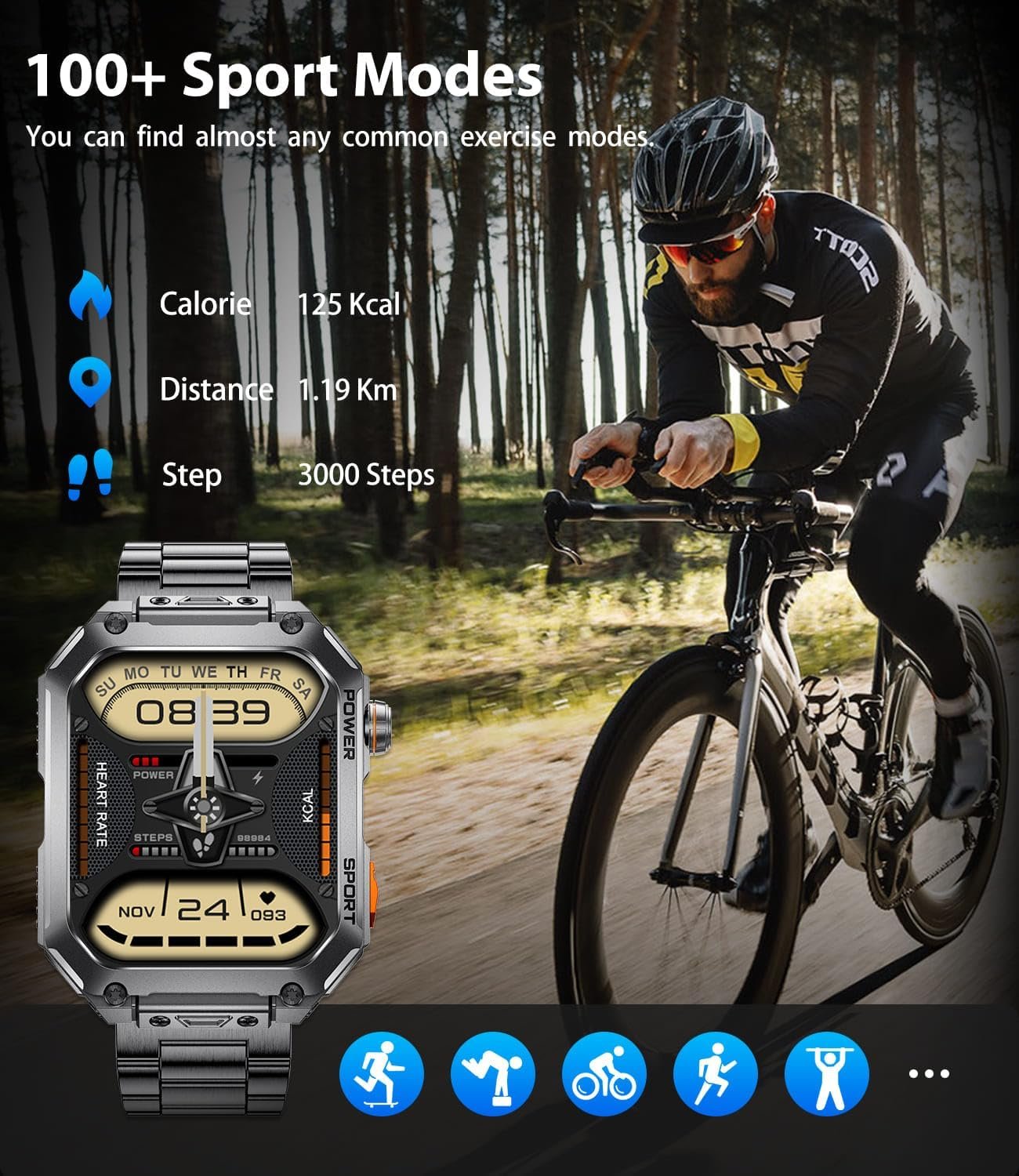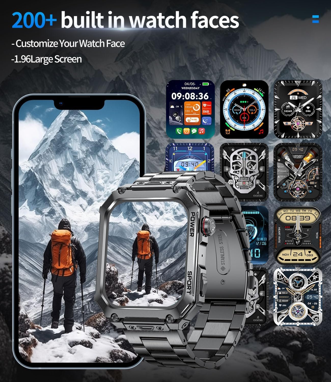 🚀【400mAh Battery & IP68 Waterproof】This waterproof smart watches for men features a 400mAh large-capacity battery, which can be fully charged in just 2 hours and provide 3-5 days of standby time in normal working conditions, or up to 20 days in low-power mode. You won’t need to worry about battery life even during outdoor activities. Made of 316 stainless steel, the outdoor smart watch is IP68 waterproof, protecting it from sweat, dust, and scratches. It’s safe to use in various environments, including exposure to rain during outdoor activities.