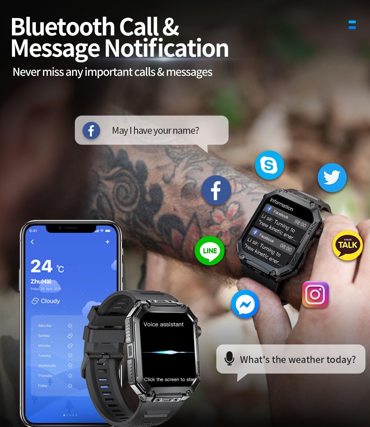 🚀【Durable Military-grade Construction】Crafted from a special aluminum alloy, our Military Smart Watch for Men has passed rigorous military-grade tests for extreme temperatures, low pressure, and dust resistance. Designed to endure harsh environments, it’s the ideal companion for outdoor adventures.