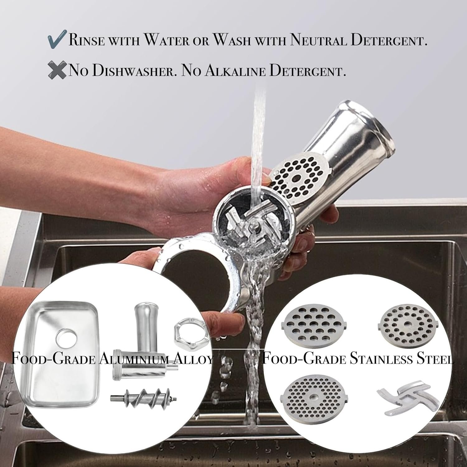 Fully Functional to Prepare Food : Meat grinder comes with 3 various stainless steel cutting plates for coarse, medium, fine grinding of meat that makes stuffing and filling, 1 big sausage stuff to help to meet your sausage stuffing needs. All cutting plates and cutting blade can be washed in the dishwasher. Complete Accessories includes 1 stainless steel cutting blade, 3 various stainless steel cutting plates; 1 plastic food pusher; 1 Sausage attachment