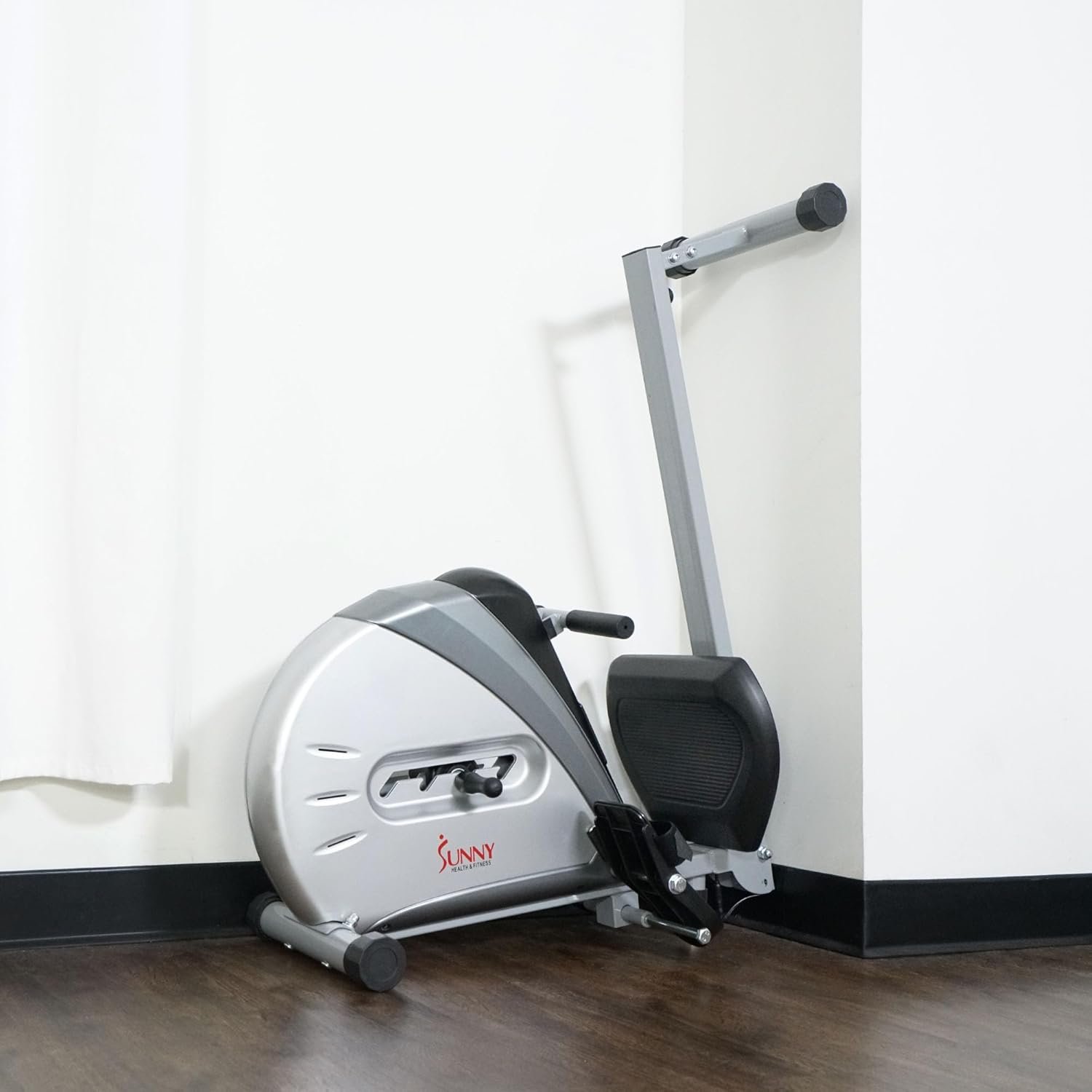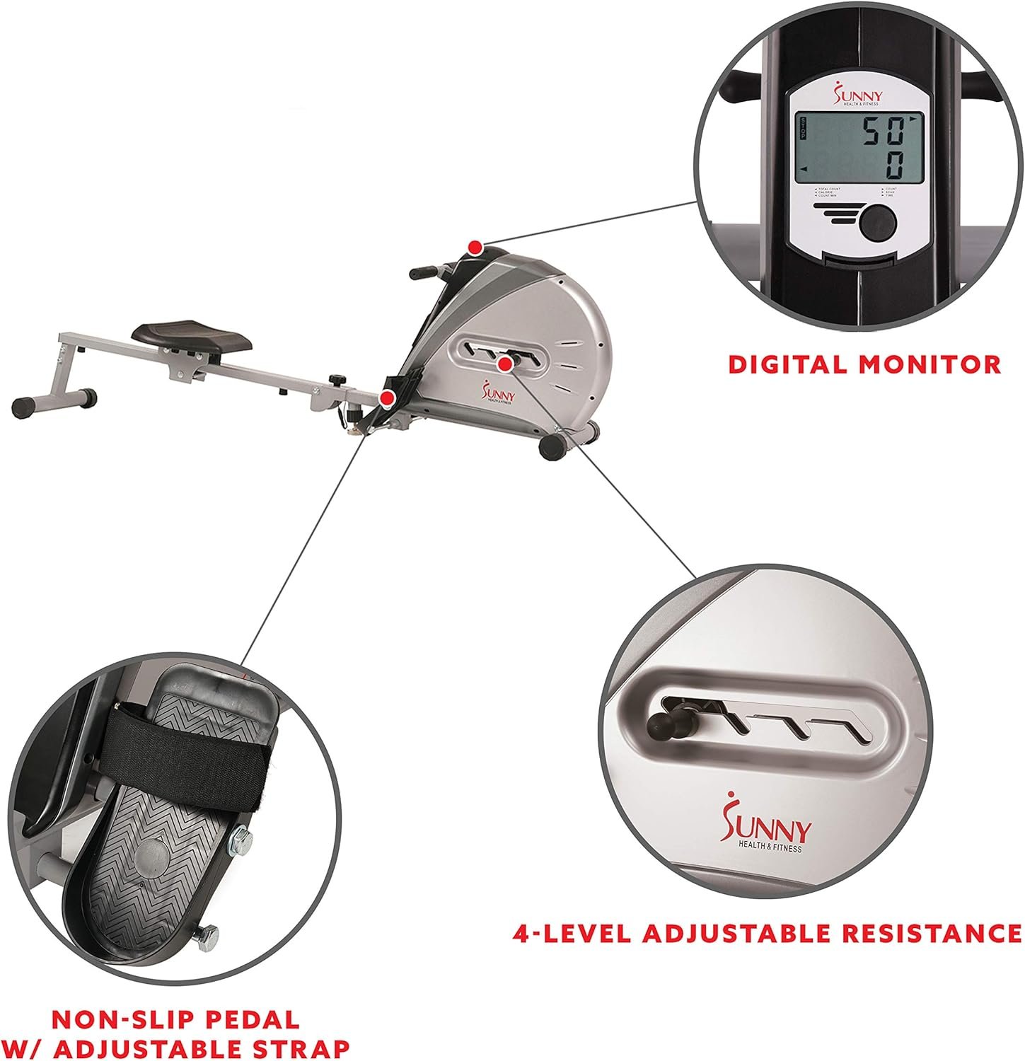 The Sunny Health & Fitness SF-RW5606 Elastic Cord Rowing Machine provides an outstanding way to increase fitness by burning calories and building muscle in a safe, low-impact way. Made of top-grade steel, this ultra-smooth and quiet rower features an elastic cord resistance with 4 levels of adjustable tension which makes it the perfect addition to your home gym. It comes equipped with large any-slip pedals with straps and an easy-to-read LCD monitor which displays Time, Calories burned, Count, Total Count, Count per minute, and Scan. Featuring the option to fold; the Sunny Health & Fitness Elastic Cord Rowing machine is very portable and can easily be stored away. Maximum user weight 220 lb.