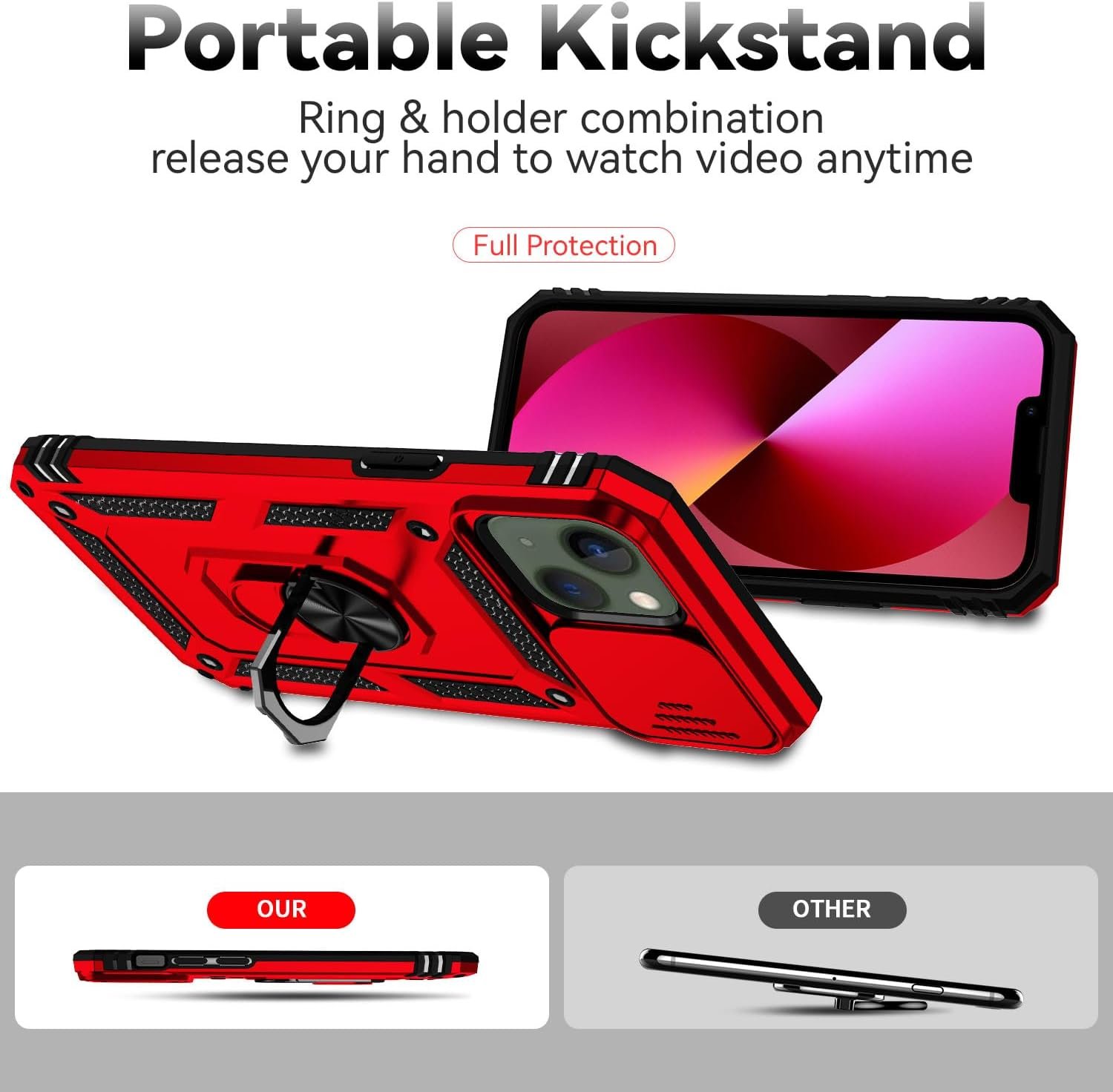 SunStory Compatible with iPhone 13 Case/iPhone 14 Case with HD Screen Protector & Slide Camera Cover & Rotated Ring Kickstand,[Military-Grade] Phone Case for iPhone 13/14 (Red)