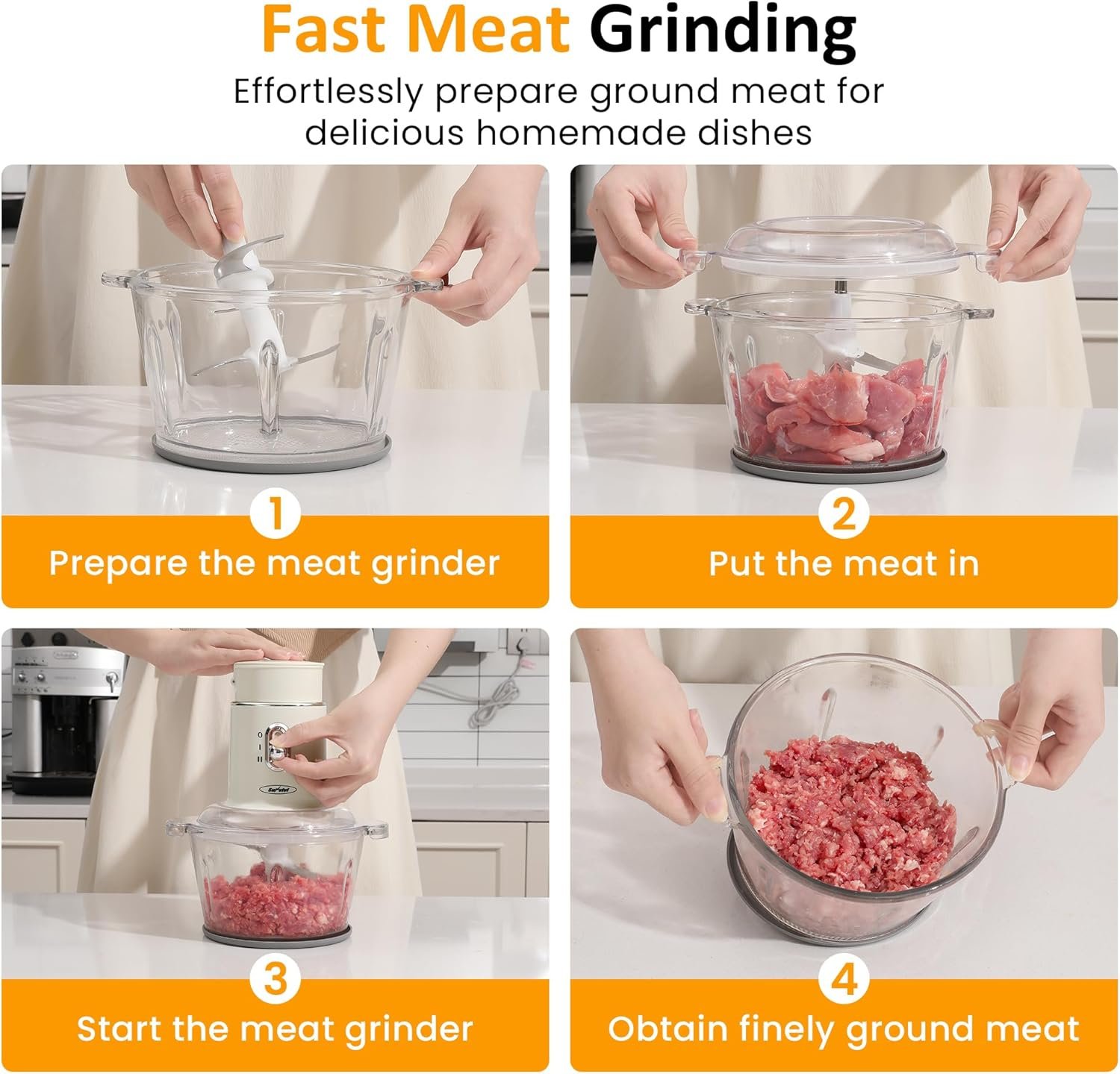 4 in 1 Food Chopper: This all-in-one appliance combines meat grinding, milling, juicing, and garlic peeling, making it ideal for vegetables, meats, coffee beans, fruits, and more. It replaces multiple single-purpose tools, saving time, space, and money while boosting convenience and efficiency.