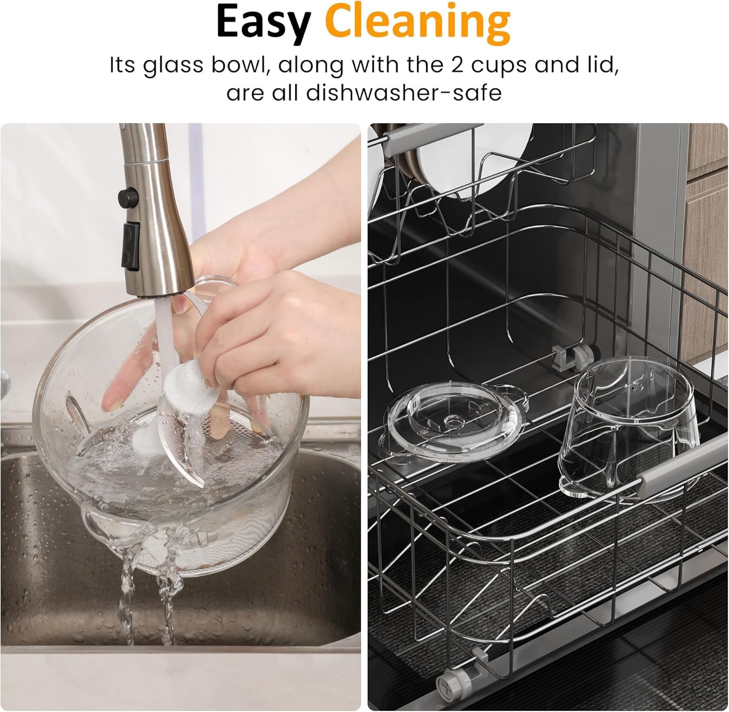 Easy Cleaning: Enjoy the convenience of effortless cleaning with our meat grinder. Its glass bowl, along with the 2 cups and lid, are all dishwasher-safe, freeing your hands for more important tasks. Spend less time on cleanup and more time creating. Embrace simplicity and ease with every use of our efficient and easy-to-maintain blender.