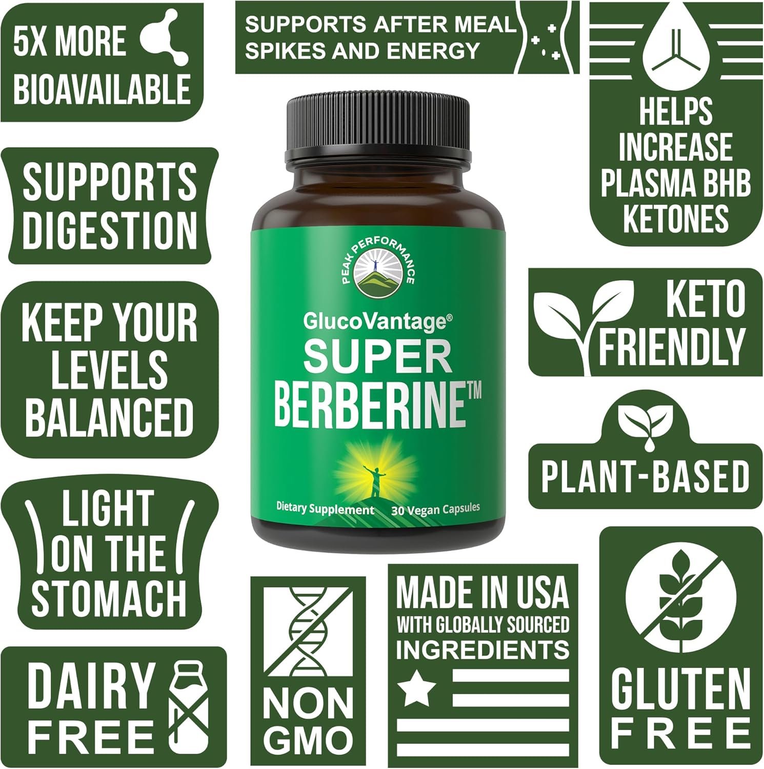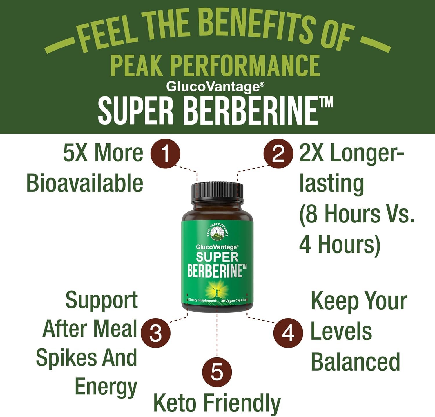 Why not 5X your berberine absorption? Peak Performance GlucoVantage Super Berberine contains Dihydroberberine (DHB), an active metabolite of berberine. Compared to regular berberine, DHB has shown to be up to 5x more bioavailable/absorbable, and 2x longer-lasting (8 hours vs. 4 hours)