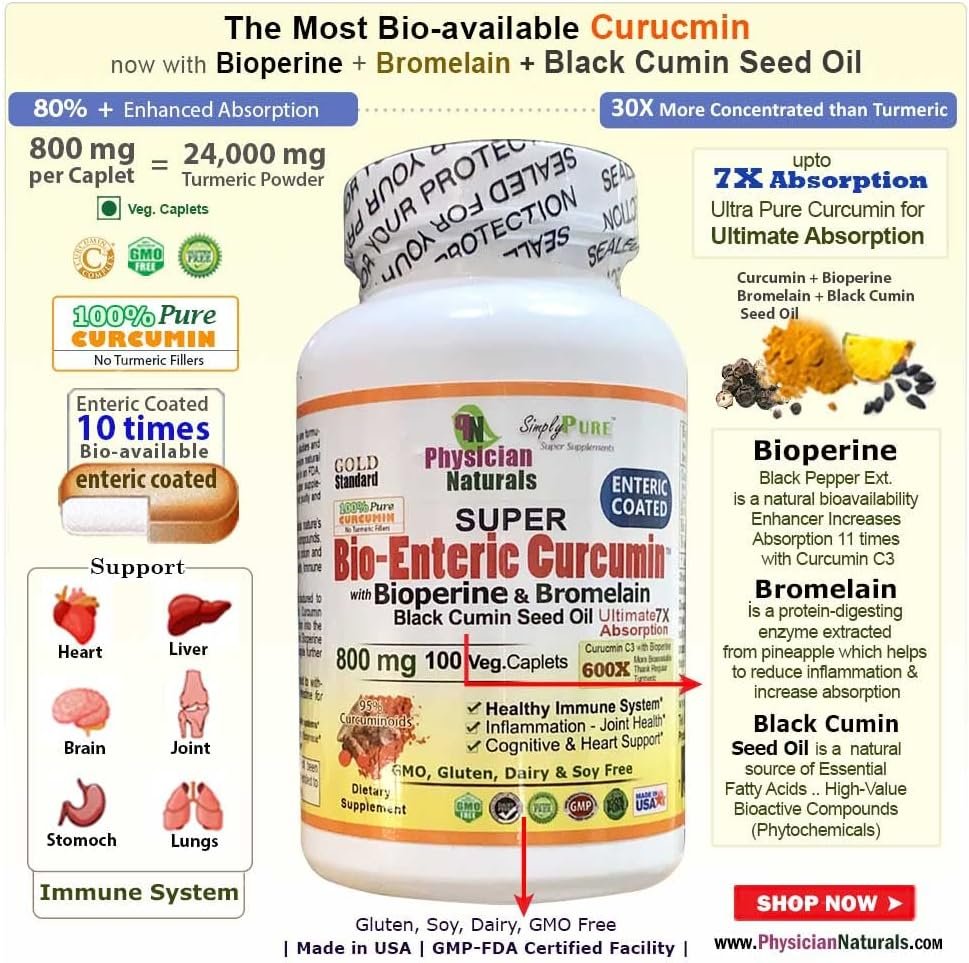 Super BioEnteric Curcumin C3 Enteric Coated with Bioperine and Bromelain with 7X Absorption is the Gold Standard for Curcumin supplements. This proprietary formulation works synergistically to dramatically increase Curcumin blood plasma levels up to 7X more and provides upto 80%+ enhanced bioavailability han regular Turmeric Curcumin. This Pharmaceutical Grade supplement with patented Curcumin C3 Complex is GMO Free like 10+ ultra-pure Physician Natural Curcumin Turmeric supplements. Manufactured in GMP certified facility in the USA with advanced delivery system for maximum assimilation. Each BioEnteric tablet contains 800 mg Curcumin C3 with Bioperine and 50 mg Bromelain to provide long lasting, Bio-available Curcumin. Enteric coating (Veg) allows the Curcumin to bypass the stomach acids and release the Curcumin in the small intestine to be absorbed into the blood stream for ultimate Bio-availability. This special aqueous based Veggie. Coating offers an optimal delivery system ensuring highest levels of Curcumin absorption. Curcumin C3 Complex is a patented extract from Turmeric root and is super anti-oxidant providing optimal protection and integrity to biological systems. The clinically tested Curcumin C3 stands out among other Curcumin extracts for its consistency, efficacy and quality and used by premiere institutes like Anderson, UCLA, etc. Bioperine is a patented and powerful extract of Black pepper fruit, supports increased nutrient absorption in the intestines upto 2-3 times. This thermo-nutrient is a natural bio-availability enhancer to improve the uptake and utilization of several key nutritional supplements. Bromelain, a superior proteolytic enzyme isolated from fresh pineapple, aids in digestion by breaking down proteins and is a powerful anti-inflammatory