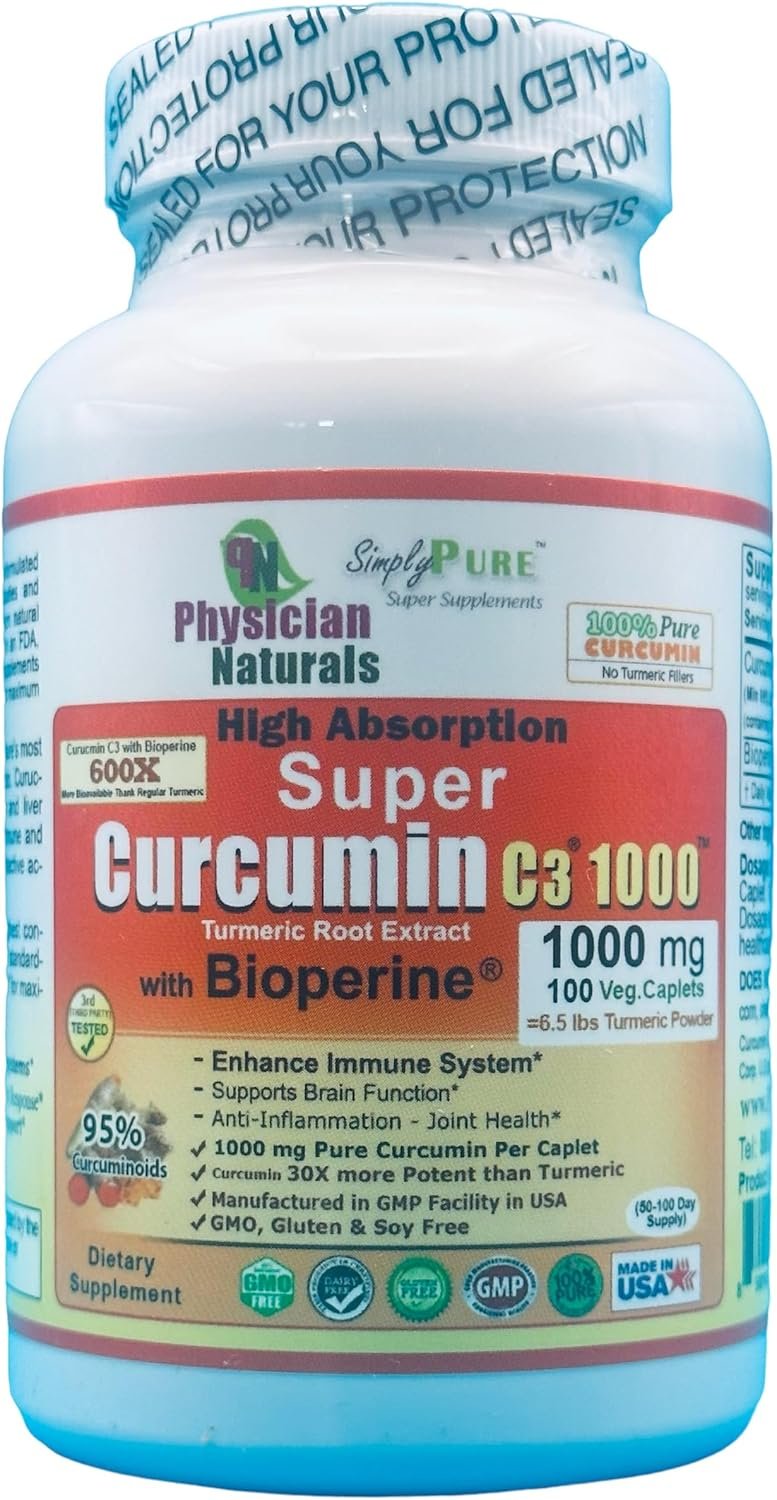 Physician Naturals High Absorption Super Curucmin C3 1000 with Bioperine contains 1000mg – 100 caplets of pure 95% Curcuminoids per caplet. Each cap contains patented Curucmin C3 Complex extracted from organic turmeric root. Curcumin C3 with Bioperine is 600X more potent than turmeric powder. Highest concentrations of active ingredients Curcuminoids combined with Bioperine to improve absorption and bio-availability. Through its antioxidant mechanisms, Curcumin may help maintain good colon health, provide joint health, anti-inflammatory and Immune support.. Each tablet of SimplyPure Super Curcumin contains 1000mg of Fast Acting, Long Lasting, Highest Bio-Available Curcumin SimplyPure Super Curcumin C3 with Bioperine provides Curcumin blood levels upto 2-3 times more than regular 95% standardized curcumin and 7-10 times more bio-availability than regular Curcumin. This premium turmeric extract in Super Curcumin 1000 with Bioperine contains minimum 95% Curcuminoids and enhanced with the Thermo-Nutrient Bioperine in order to significantly increase absorption and bioavailability. The same Curcumin C3 is used by MD Anderson, UCLA, in research and clinical trials. Physician Naturals Curcumin is recommended by more practitoners than any other brand. SimplyPure Curcumin supplements are manufactured in an GMP certified facility in the USA. Our premium super supplements are optimized with proprietary formulations for enhanced absorption and delivery systems to help support healthy life. We monitor and maintain exceptional Quality standards from raw material purchases to manufacturing process control and Test every batch by accredited testing laboratories and provide COA. Super Curcumin 1000 does not contain sugar, salt, starch, yeast, wheat, gluten, corn, soy, milk, egg, shellfish or preservatives. GMO Free Dosage: 1-2 Caplets daily with meals as a maintenance supplement. Dosage varies with each individual, consult a healthcare professional.