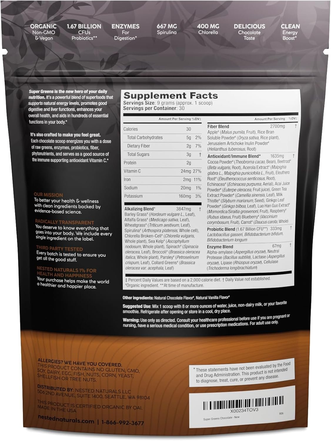 Super Greens #1 Green Superfood Powder | 100% USDA Organic Non-GMO Vegan Supplement | 20+ Whole Foods (Spirulina, Wheat Grass, Barley), Probiotics, Fiber & Enzymes (Original, 30 Servings) (Chocolate)
