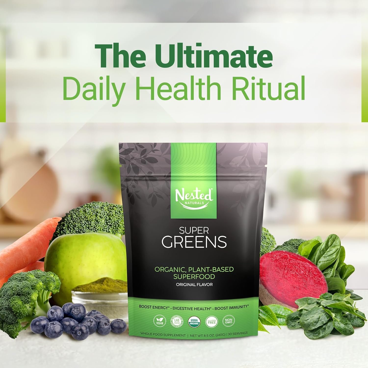Natural, Clean Energy: Super Greens Supercharge your routine with caffeine-free energy. Our organic greens and superfoods provide a sustainable boost, packed with antioxidants, to keep you energized and focused, naturally.
