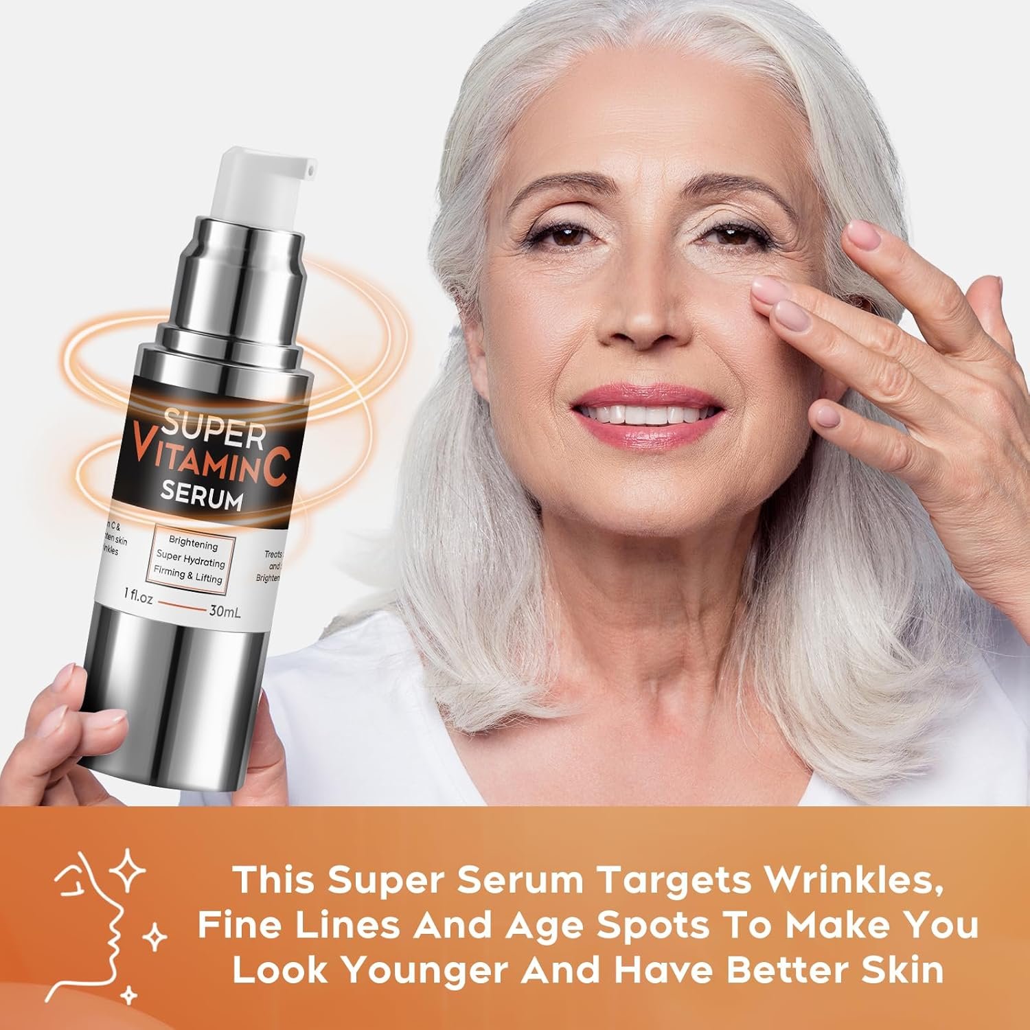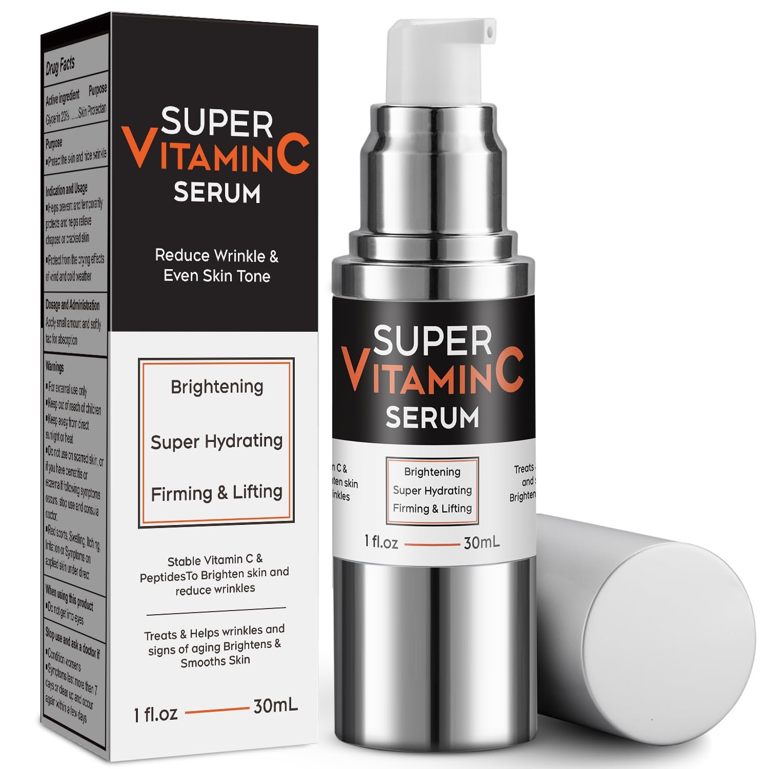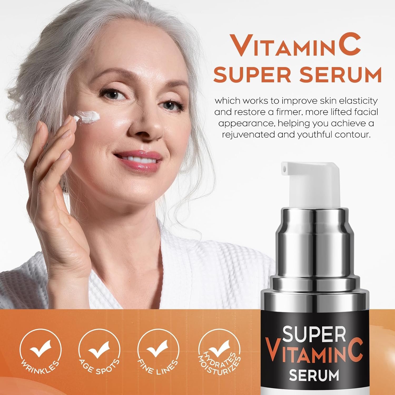 Super Vitamin C Face Serum with Formula Hydrates, Firms, Lifts, Targets Age Spots, Potent Anti Aging, Wrinkles, & Smooths Skin, Cruelty Free -For All Skin Types. 1 fl oz, White
