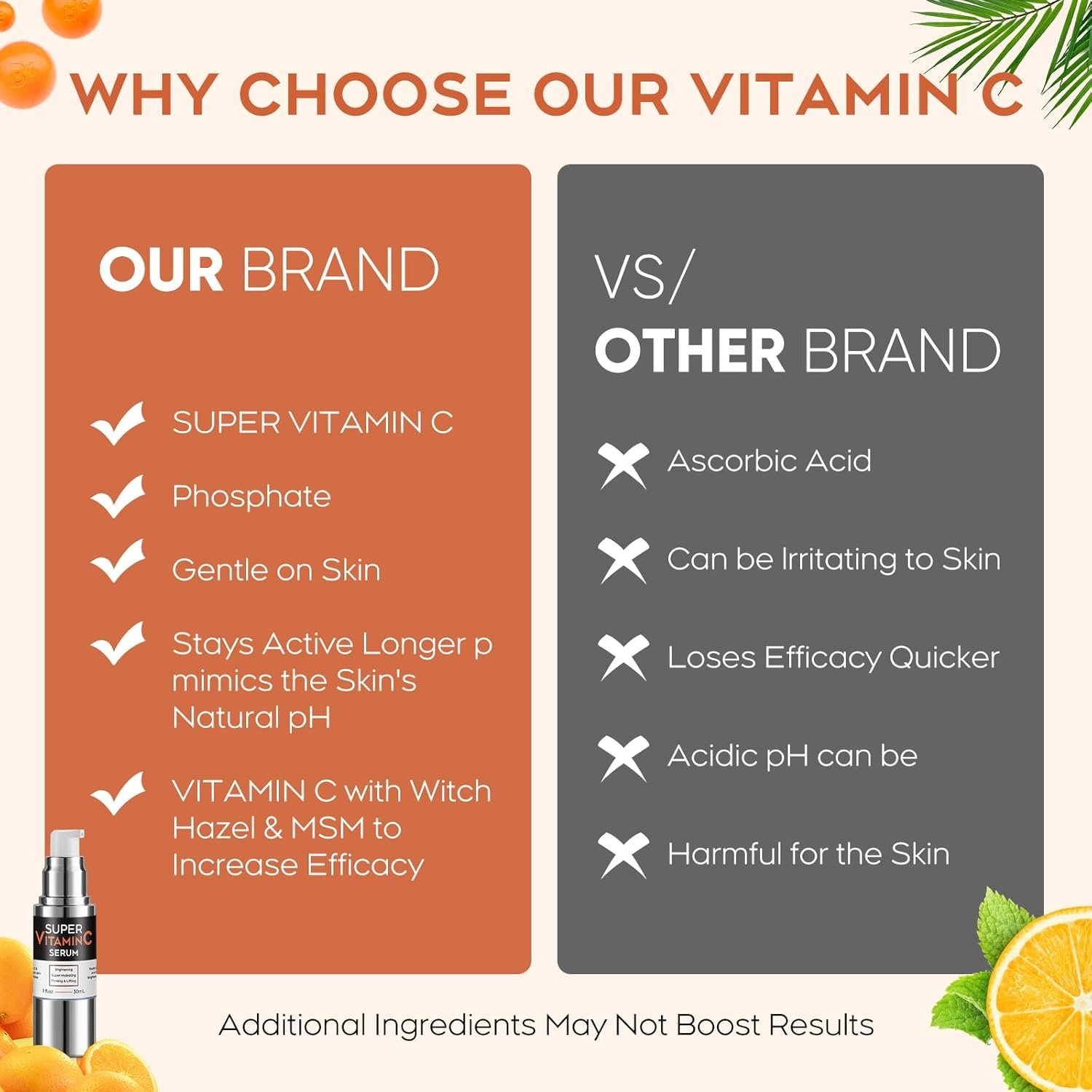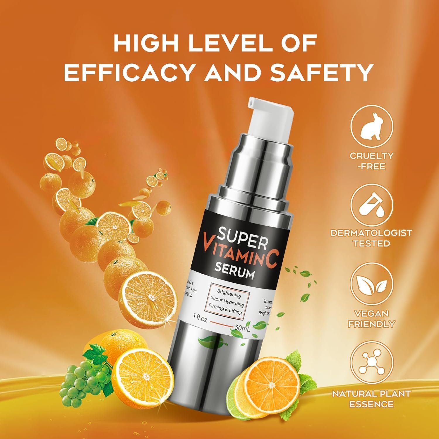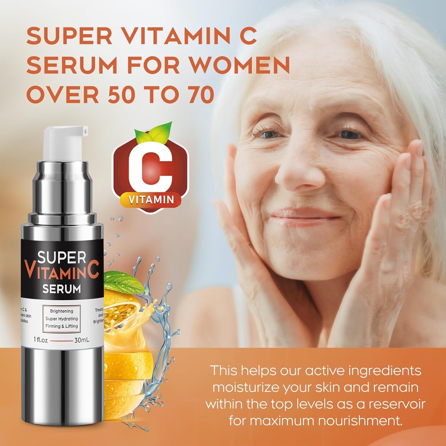 Super Vitamin C Face Serum with Formula Hydrates, Firms, Lifts, Targets Age Spots, Potent Anti Aging, Wrinkles, & Smooths Skin, Cruelty Free -For All Skin Types. 1 fl oz, White
