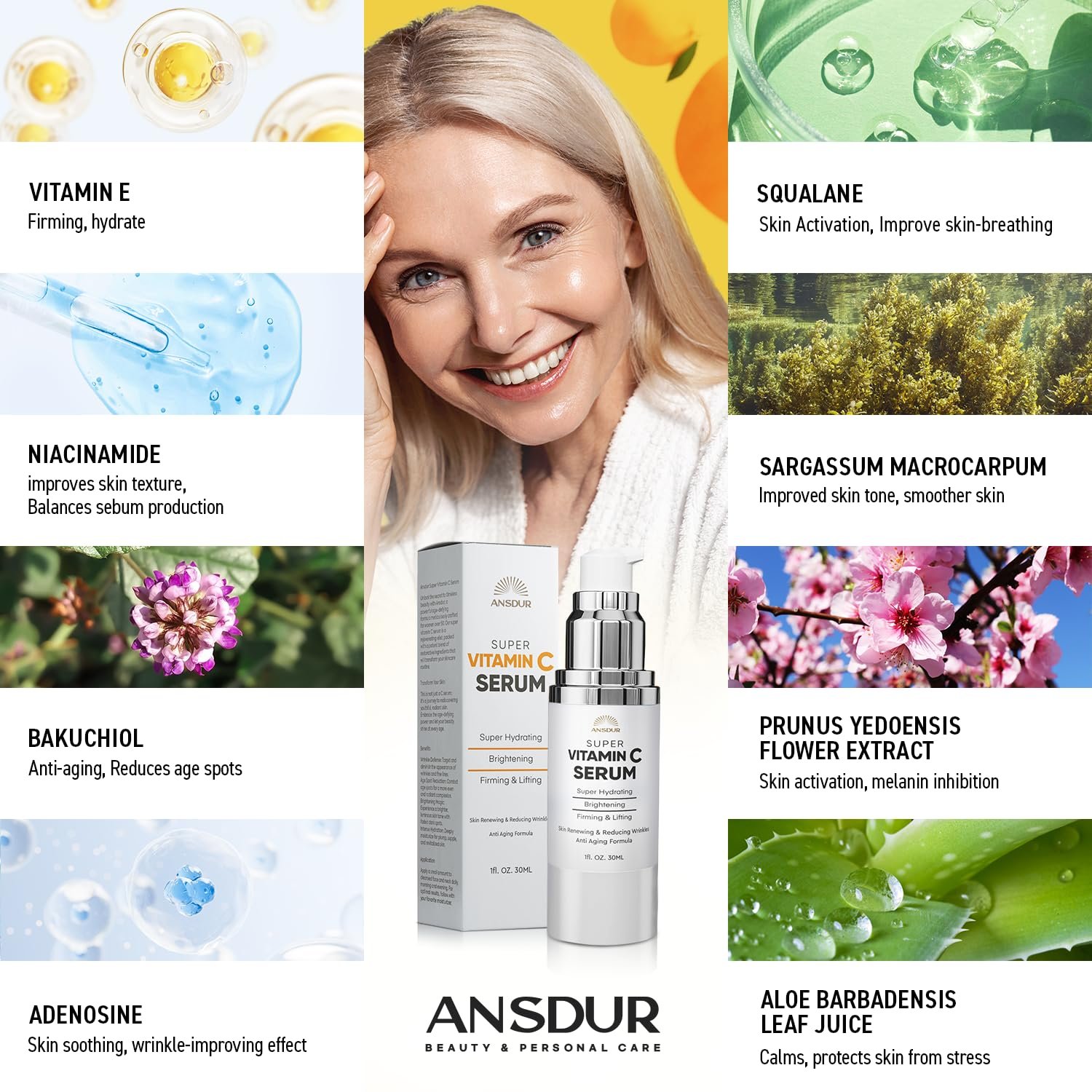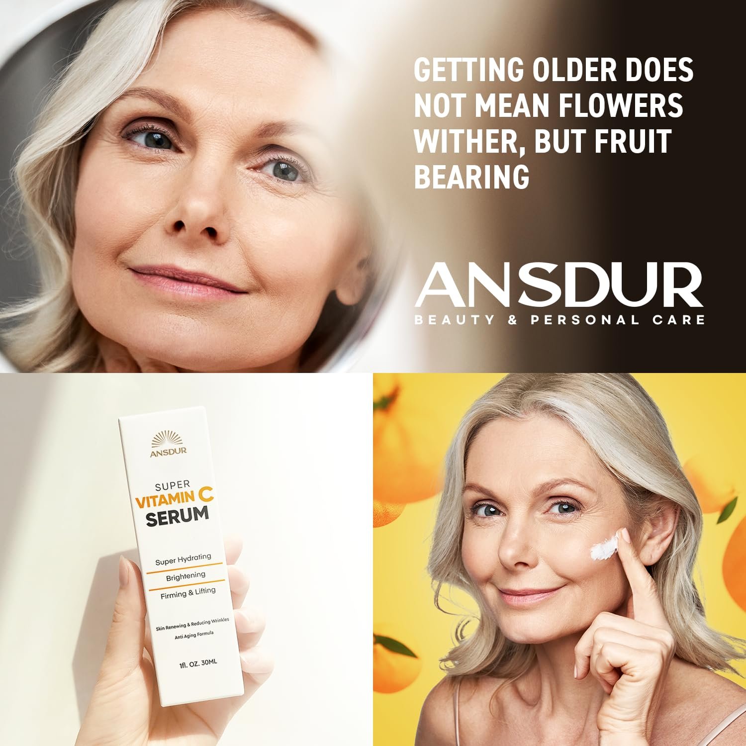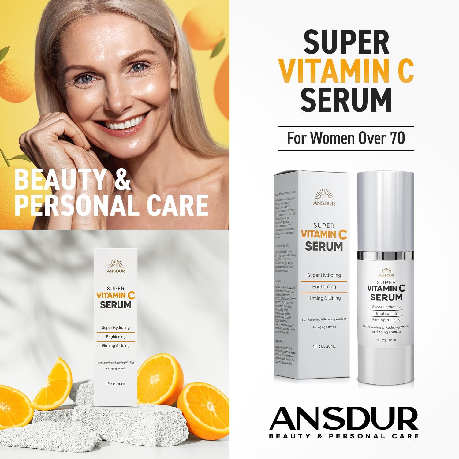 Super Vitamin C Serum for Women Over 70: This powerful Vitamin C serum combines Hyaluronic Acid, Peptides, and Bakuchiol to target fine lines, wrinkles, and age spots while promoting radiant, youthful skin.