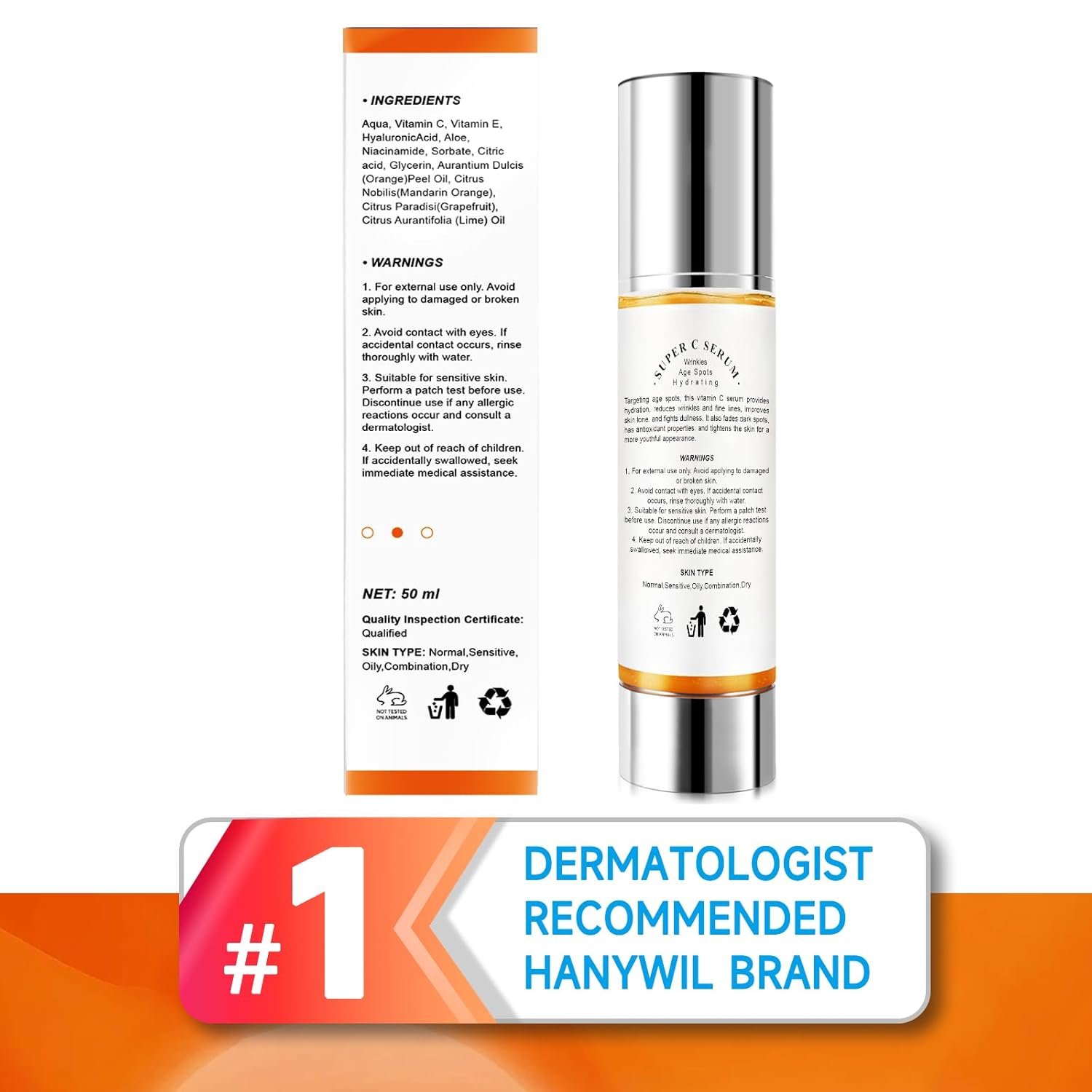 Multi-Tasker Vitamin C Face Serum: HANYWIL Super Vitamin C Serum combats signs of aging with a vitamin C serum enriched with Vitamin C, Vitamin E, Hyaluronic Acid, Aloe, and Botanical extracts. One drop delivers a powerful dose making it an essential part of the skin care routine.