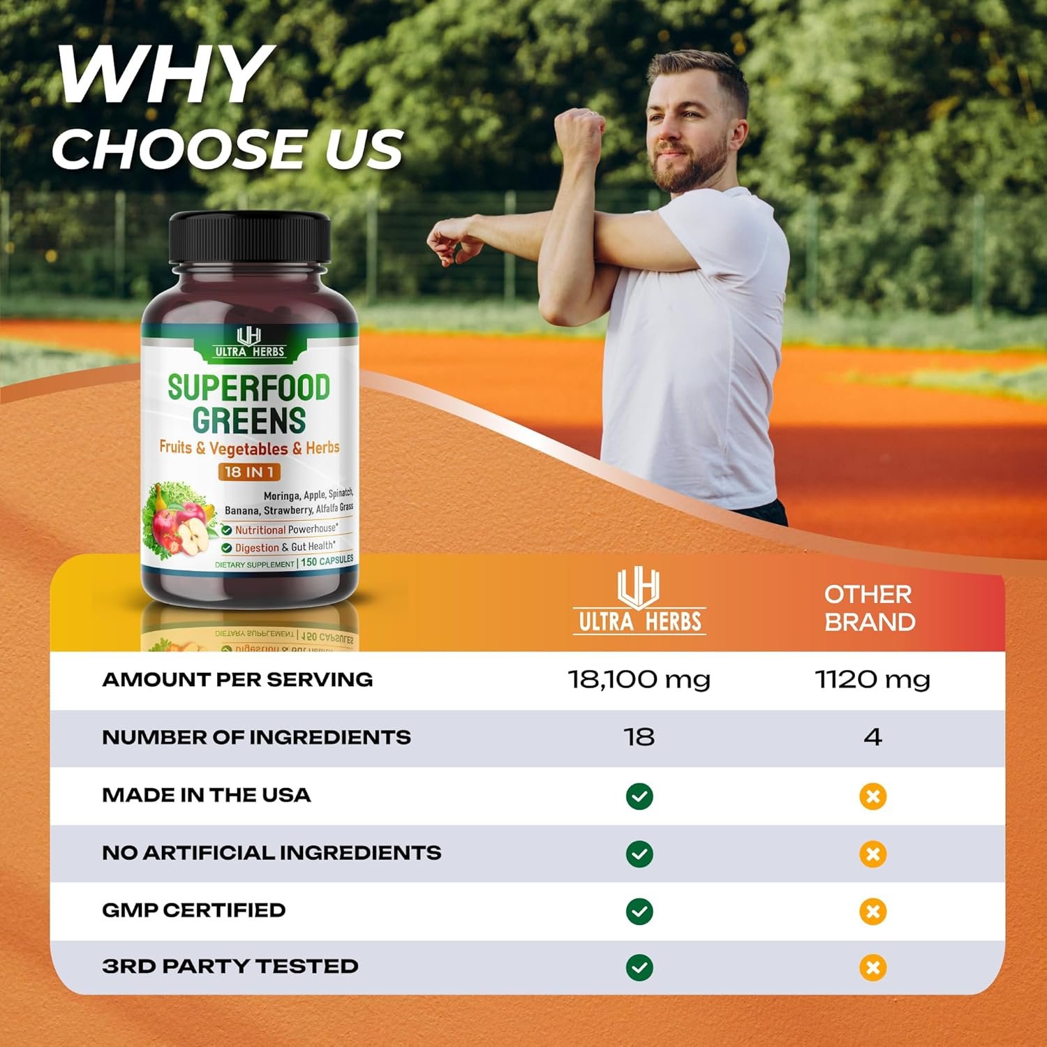 18-IN-1 NUTRITIONAL MIX: Ultra Herbs Superfood Greens capsules contain 18 carefully chosen natural ingredients, including 14 extracts from the Organic Fruit & Vegetables Blend (Moringa, Apple, Bell Pepper, Spinach, Banana, Cauliflower, Orange, Strawberry, Blueberry, Pineapple, Watermelon, Mango, Grapes, Avocado), 3 extracts from the Organic Greens Blend (Alfalfa Grass, Barley Grass, Oat Grass), and Black Pepper. Simplify your routine – just one daily capsule makes a significant difference.