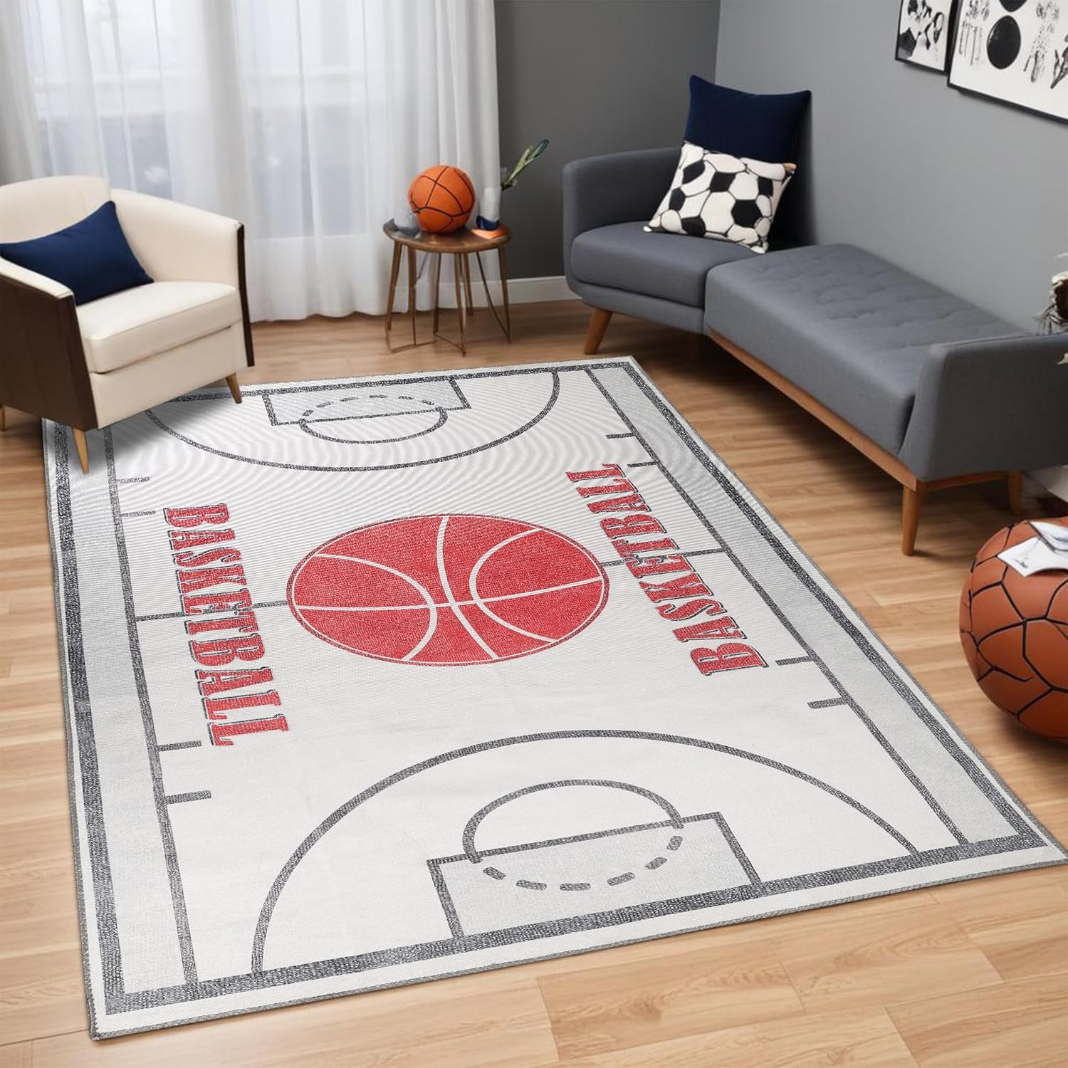 𝐒𝐓𝐘𝐋𝐄 𝐀𝐍𝐃 𝐃𝐄𝐒𝐈𝐆𝐍: Displays a Red basketball and basketbal court pattern with an Ivory color base; Pairs with a variety of home decor styles; Modern, Eclectic, Casual, or Transitional
