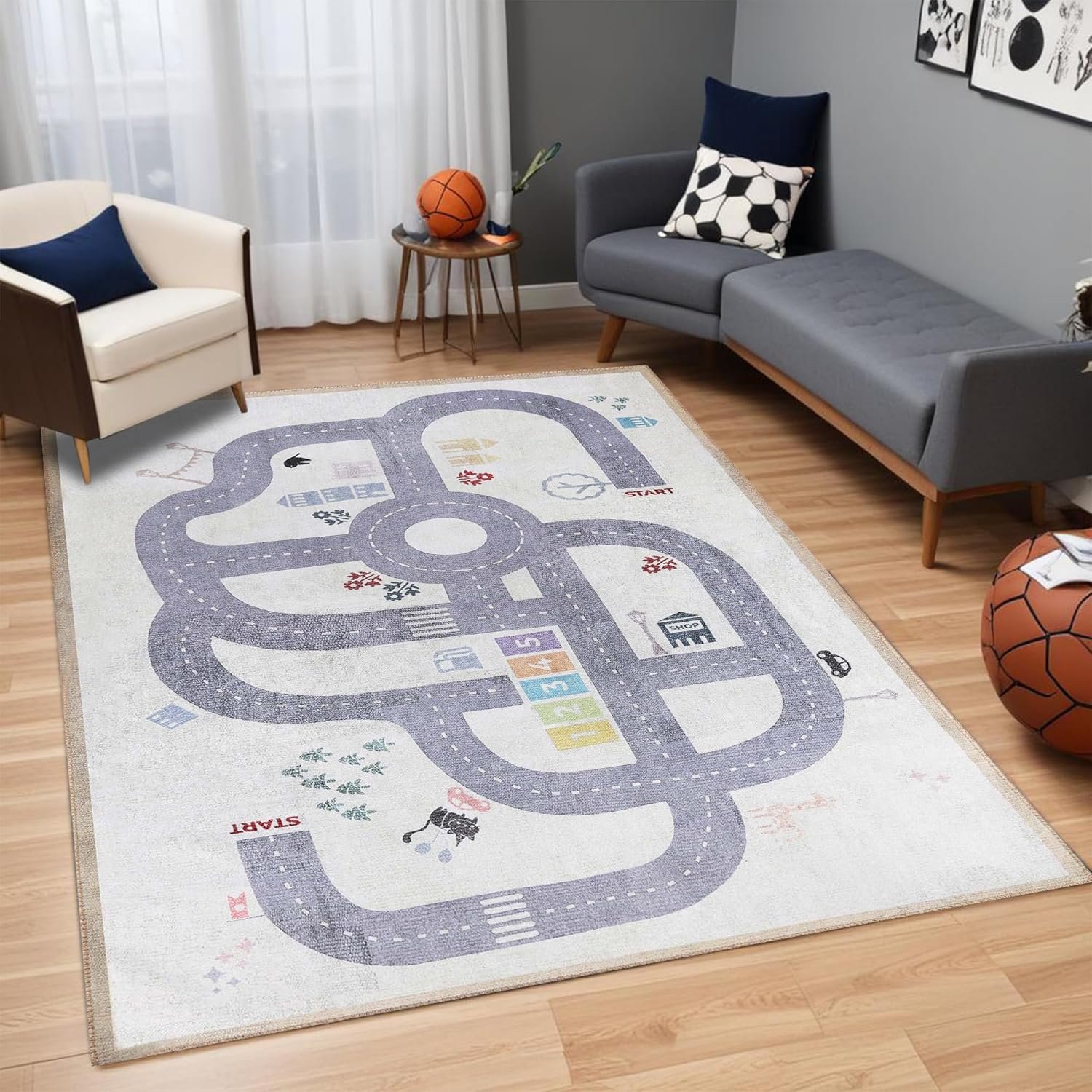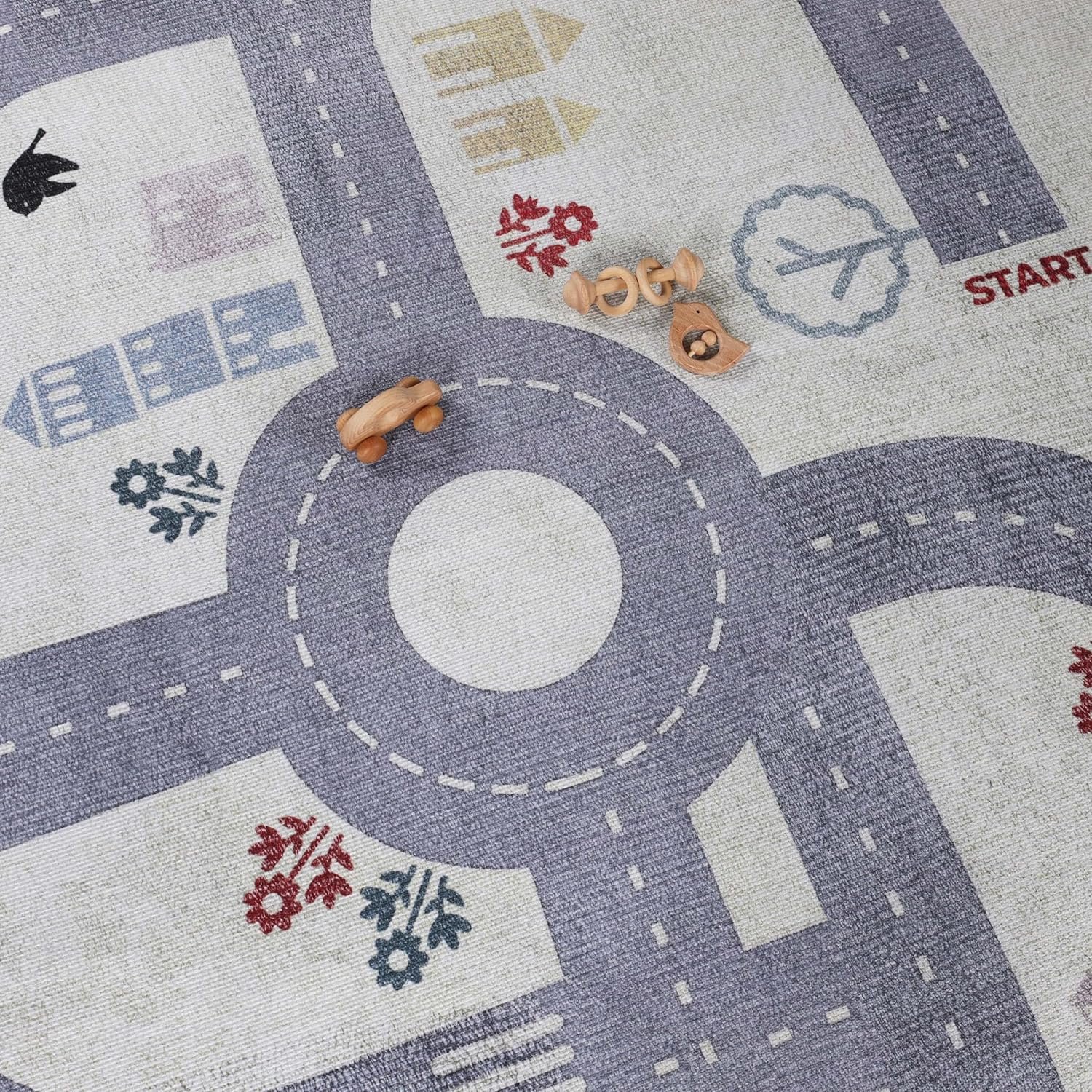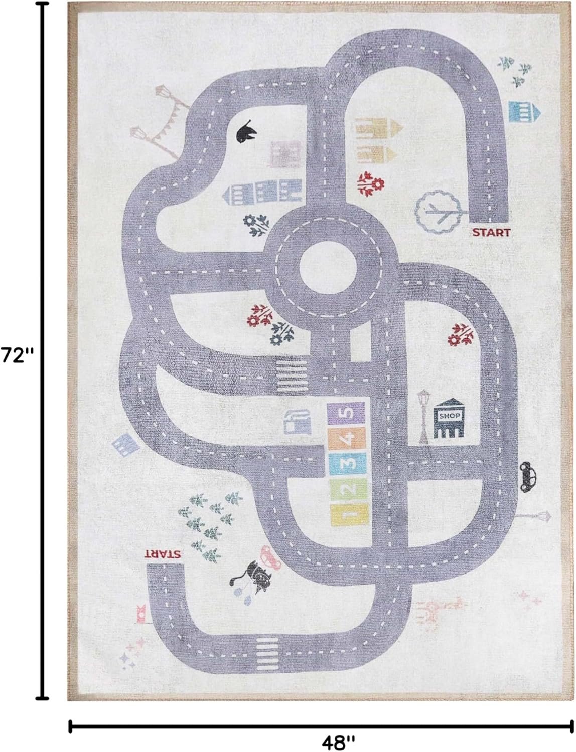 𝐒𝐓𝐘𝐋𝐄 𝐀𝐍𝐃 𝐃𝐄𝐒𝐈𝐆𝐍: Displays a fun interactive path, road pattern in Grey with an Ivory color base; Pairs with a variety of home decor styles; Modern, Eclectic, Casual, or Transitional