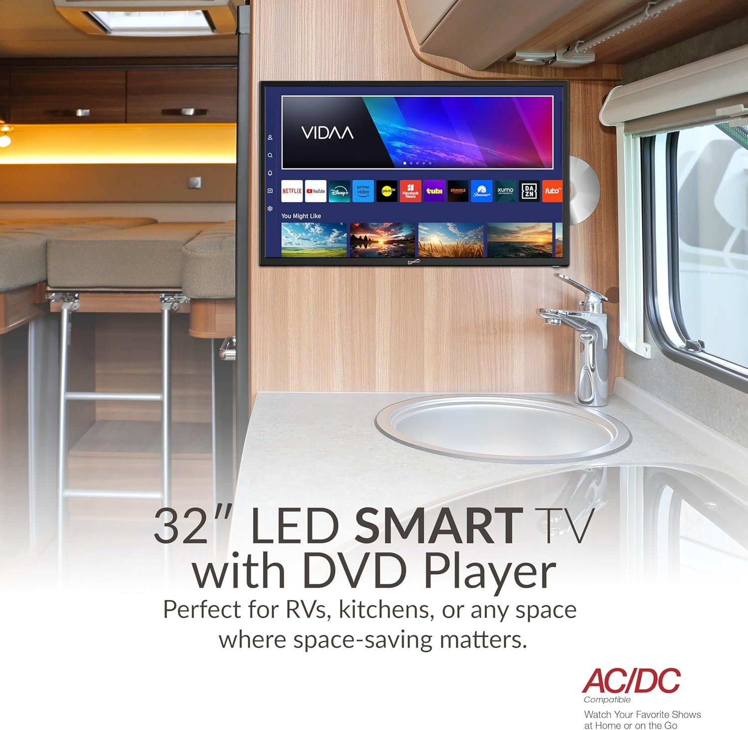 Supersonic SC-3226SDVD 32-inch LED Smart HDTV w/DVD Player, ATSC & NTSC System, 3X HDMI, 1080p, WiFi, USB, Multi Language OSD, AC/DC Compatible for Home, Kitchen, or RV Camper, DC Car Cord Included