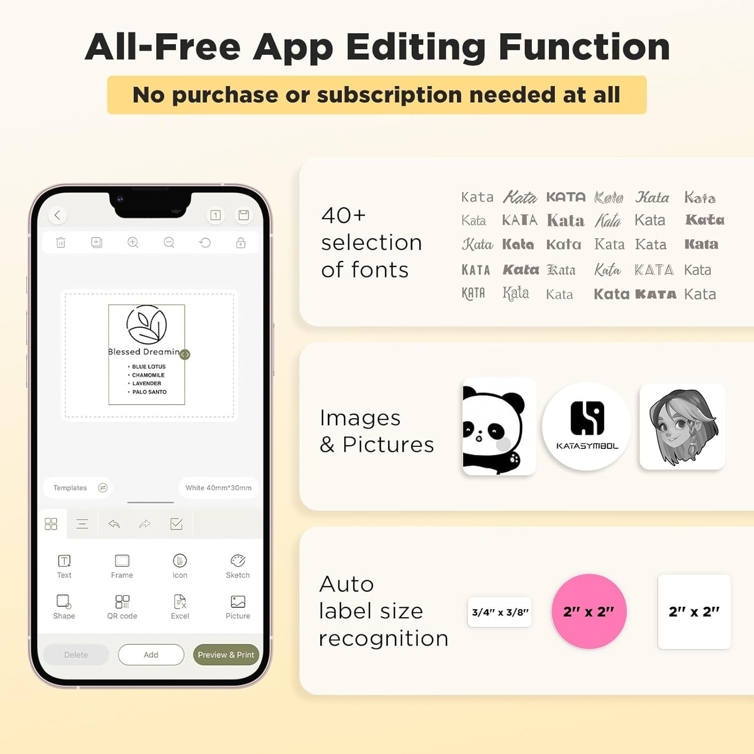 [POWERFUL App EDITING FUNCTION] The ‘Katasymbol’ App makes it easy to add images from your phone or tablet, allowing you to display any information on the label. Customize your label with over 40 fonts, 30 frames, and 450+ icons provided by the App at no cost.
